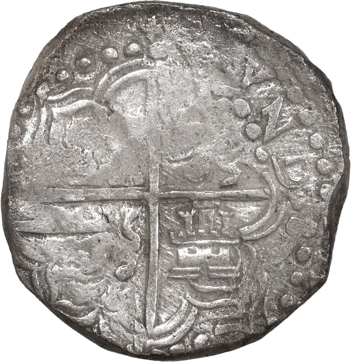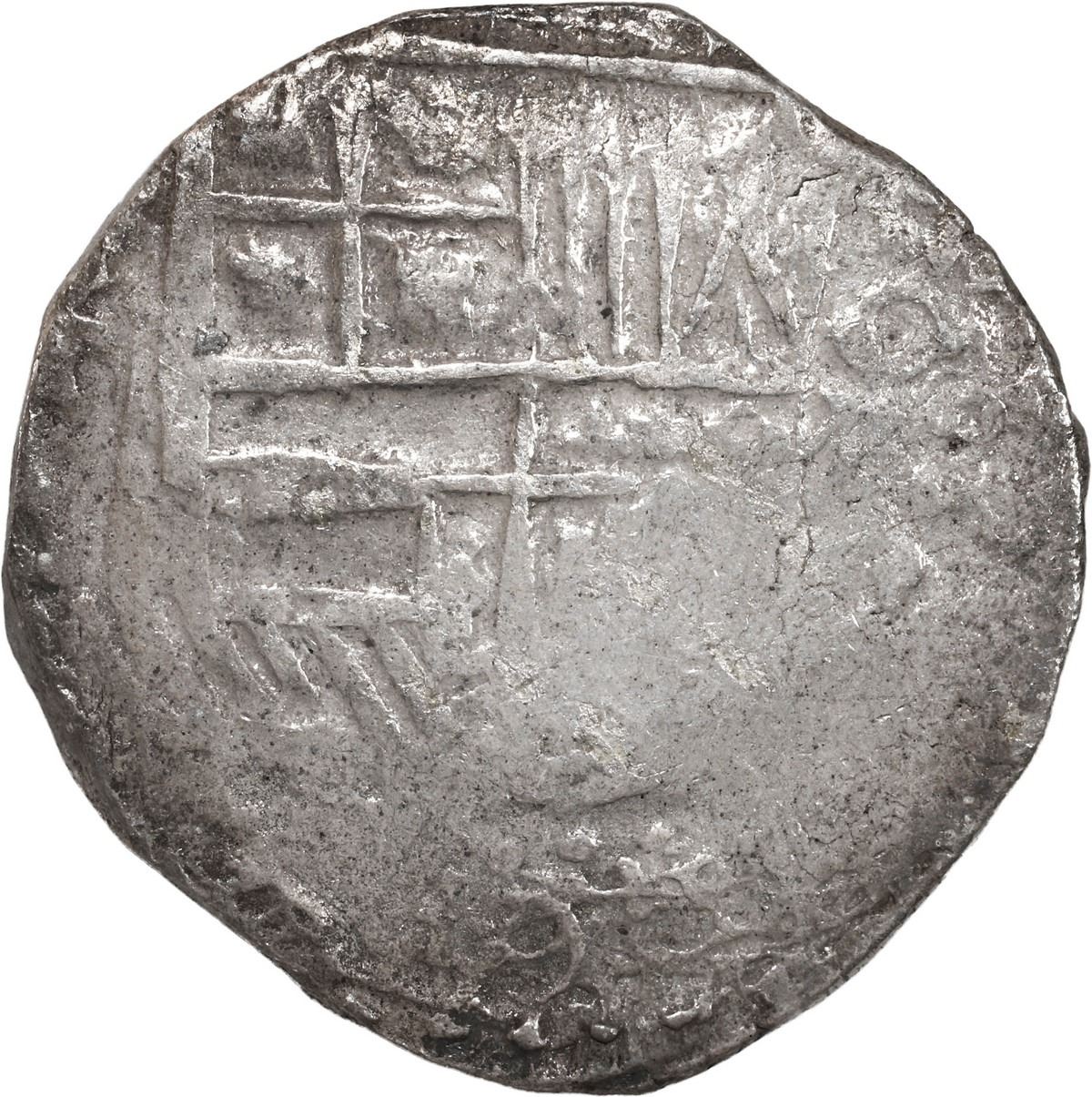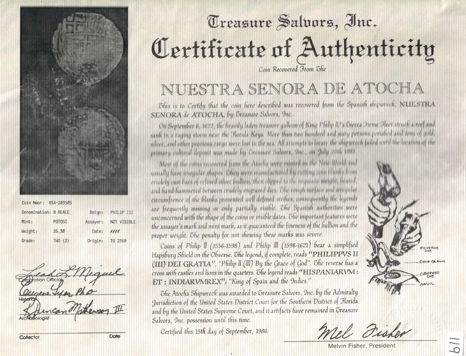 BOLIVIA, Potosí, cob 8 reales, Philip III, assayer not visible, Grade 2. KM-10. 26.46 grams. Nearly full weight (choice for the assigned Grade) and with only minimal, localized surface corrosion, silvery except near edge, full but partially flat shield and cross, possibly a flipover double strike because there is a full and clear 6 (which can only come from the date) below the shield!. With original Fisher tag and certificate 85A-203505. Recovered from: Atocha, sunk in 1622 west of Key West, Florida