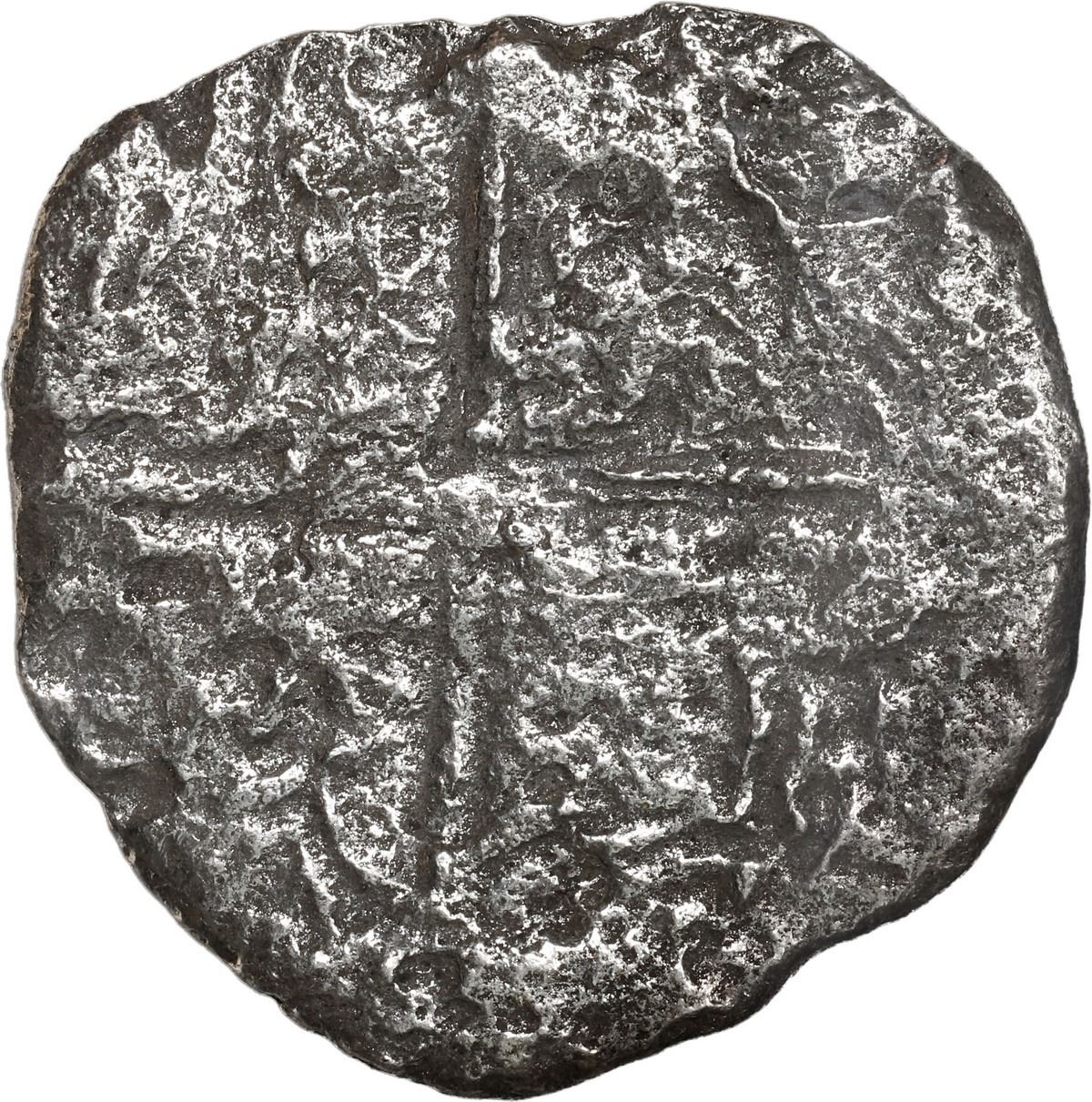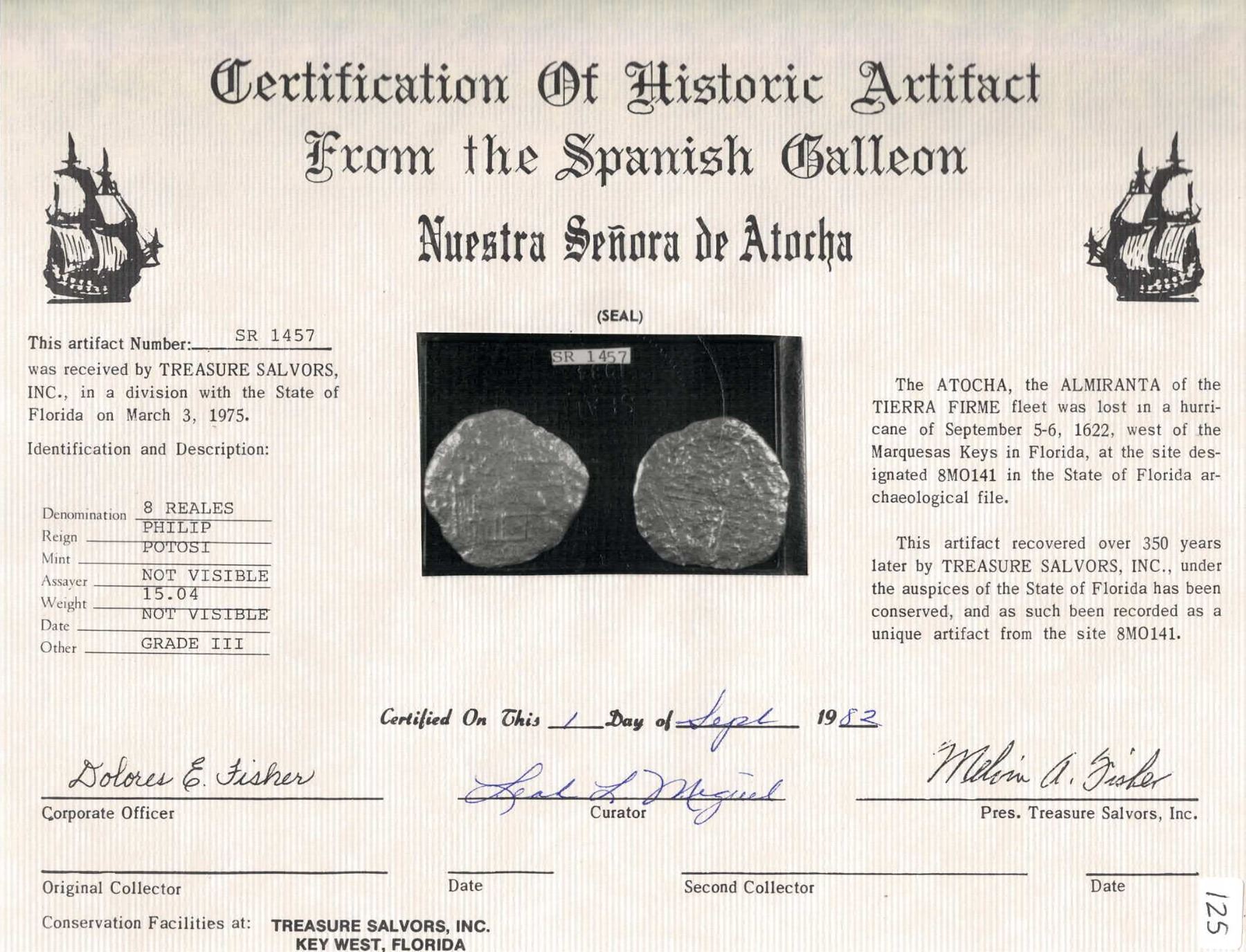 BOLIVIA, Potosí, cob 8 reales, Philip III, assayer not visible, Grade 3, with State Release certificate from 1982. KM-10. 15.08 grams. Silvery and thin from heavy corrosion but with nearly full shield and cross still evident, interesting as among a group of coins originally divided to the State of Florida but then won back in court. With original Fisher tag and photo-certificate SR 1457. Recovered from: Atocha, sunk in 1622 west of Key West, Florida