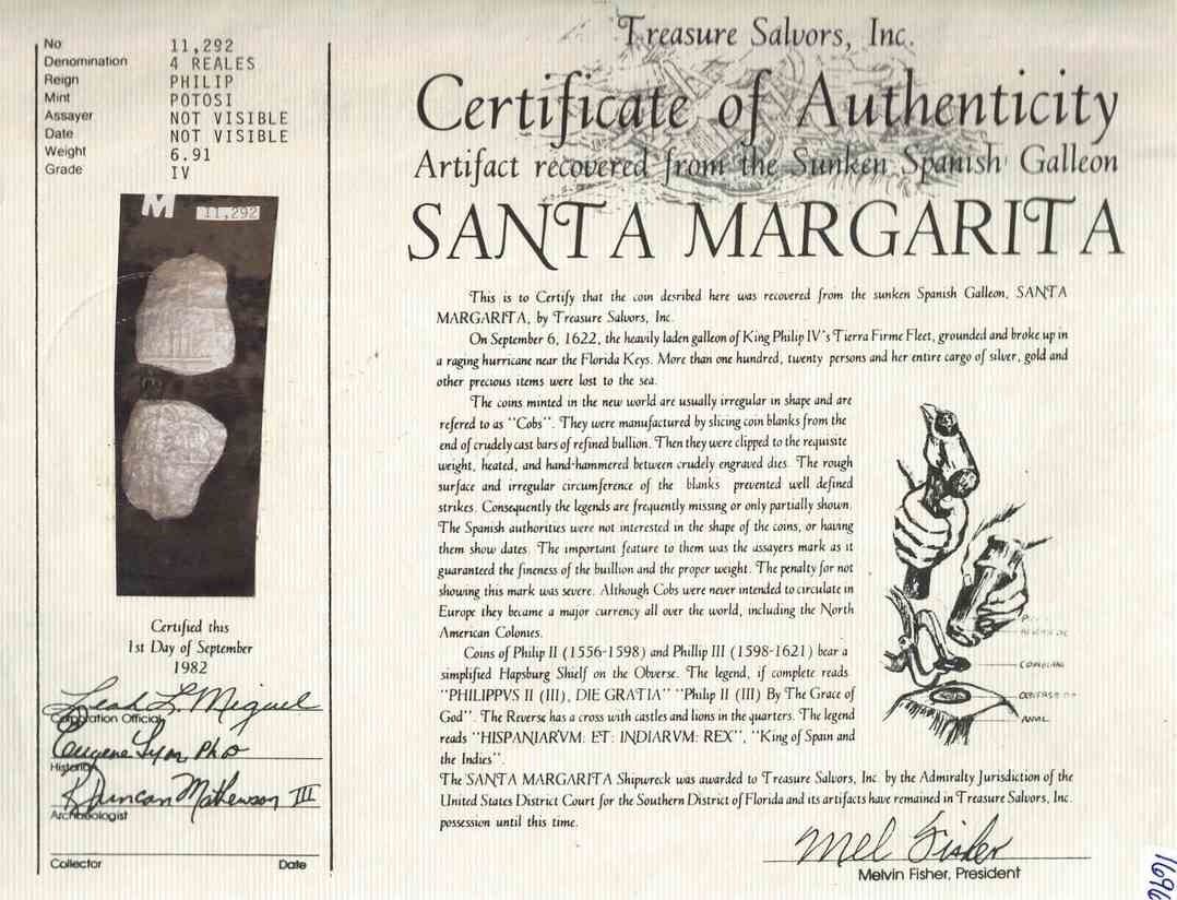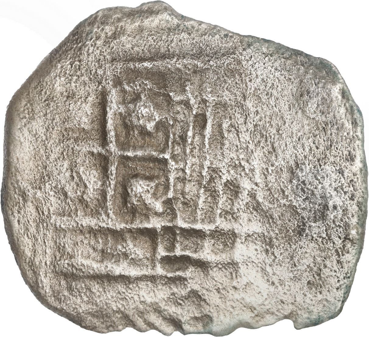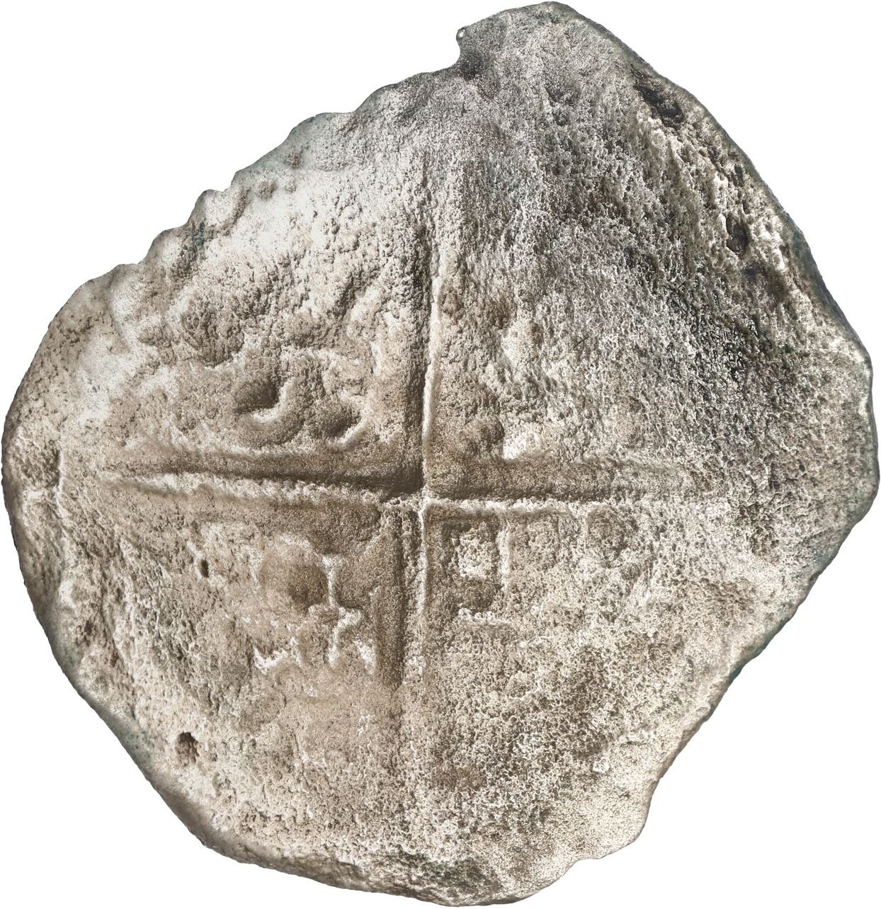 BOLIVIA, Potosí, cob 8 reales, Philip III, assayer not visible, quadrants of cross transposed, Grade 3. KM-10; Cal-Type 164. 11.97 grams. Thin along the edge from corrosion but with a fair amount of shield and cross detail visible. With original Fisher tag and photo-certificate 4727. Recovered from: Santa Margarita, sunk in 1622 west of Key West, Florida