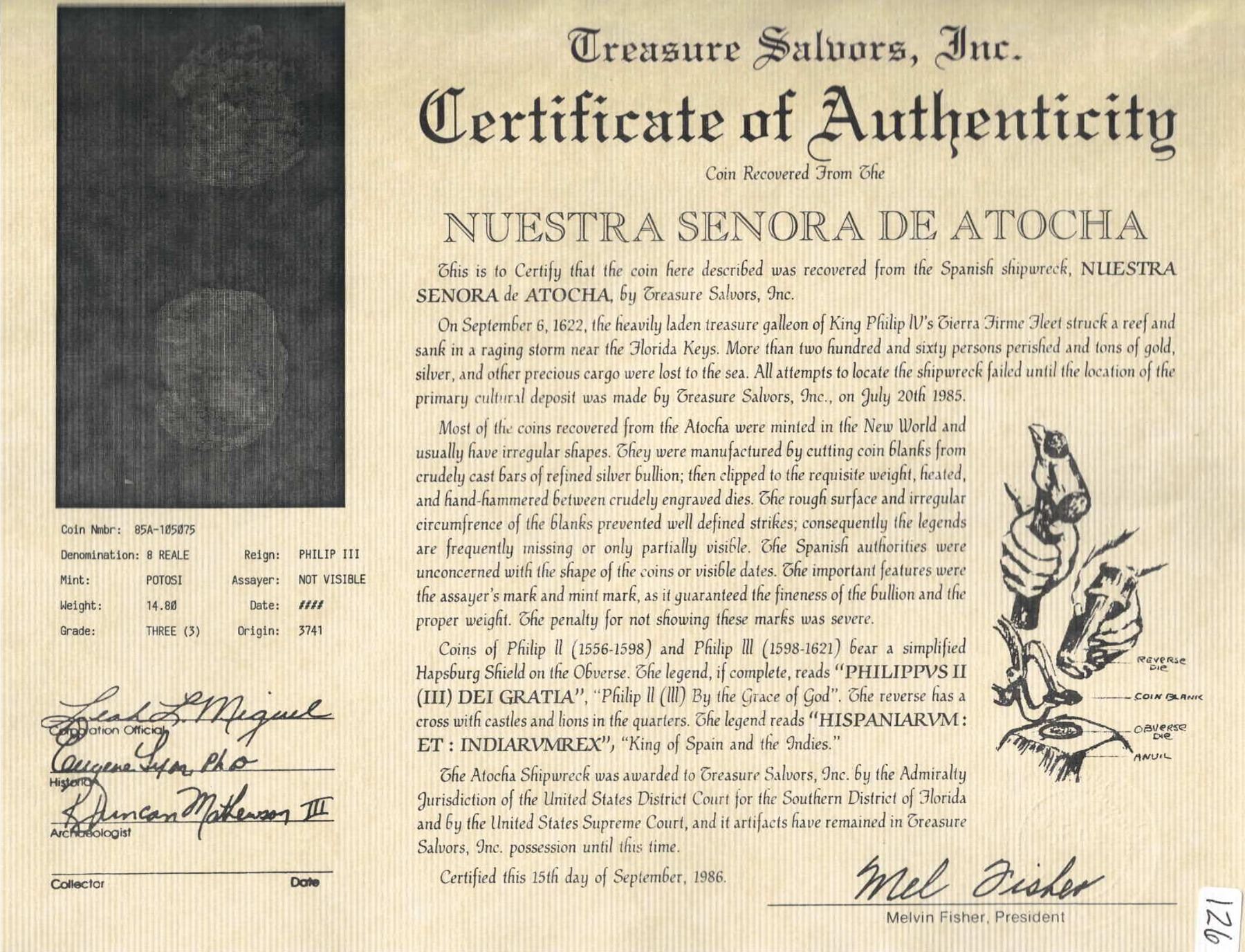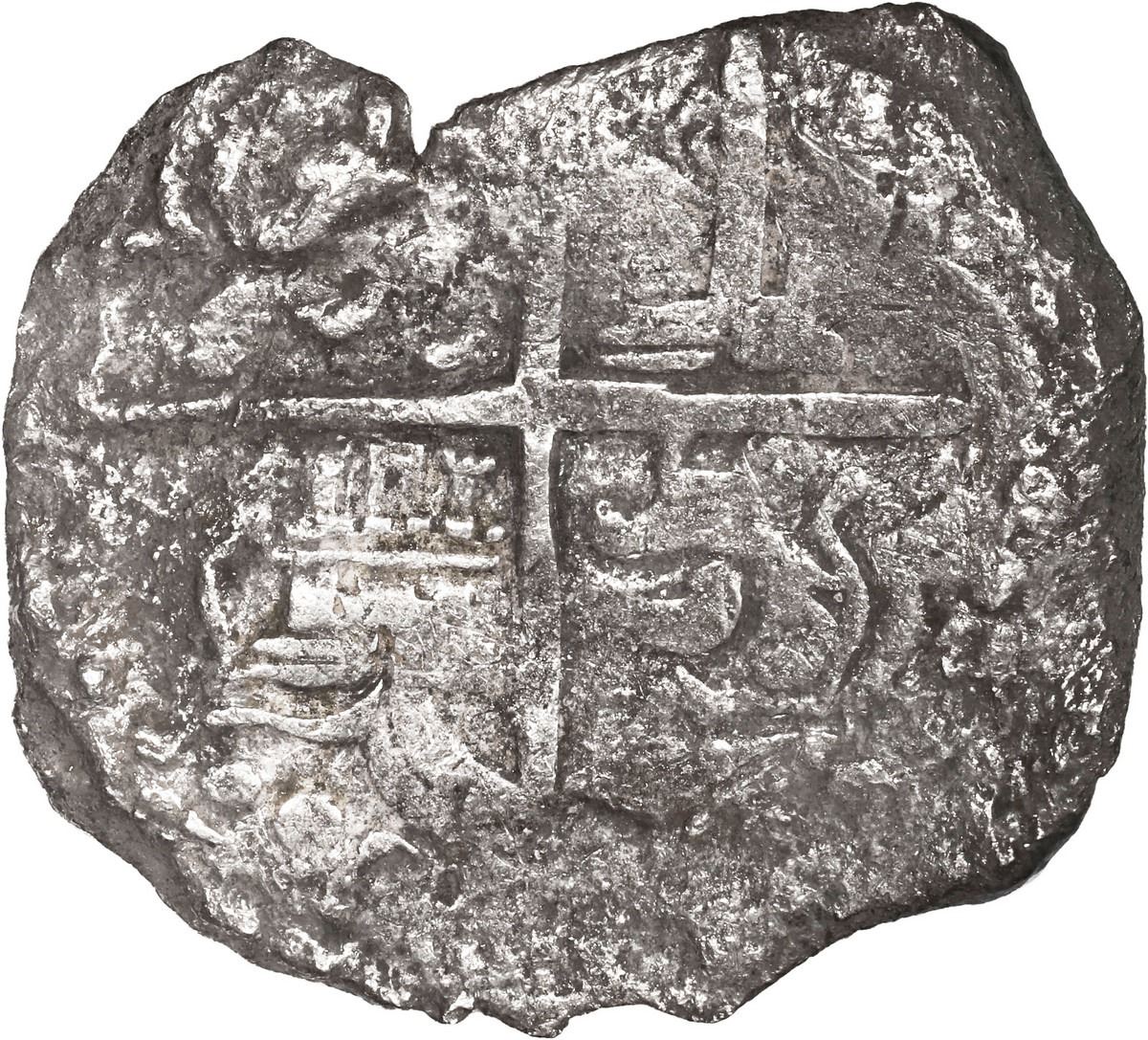 BOLIVIA, Potosí, cob 8 reales, Philip III, assayer not visible, quadrants of cross transposed, Grade 3. KM-10. 15.07 grams. Darkly toned, rather thin from heavy corrosion (especially on shield side) and with some edge-loss but nearly full cross nonetheless. With original Fisher tag and certificate 85A-105075. Recovered from: Atocha, sunk in 1622 west of Key West, Florida