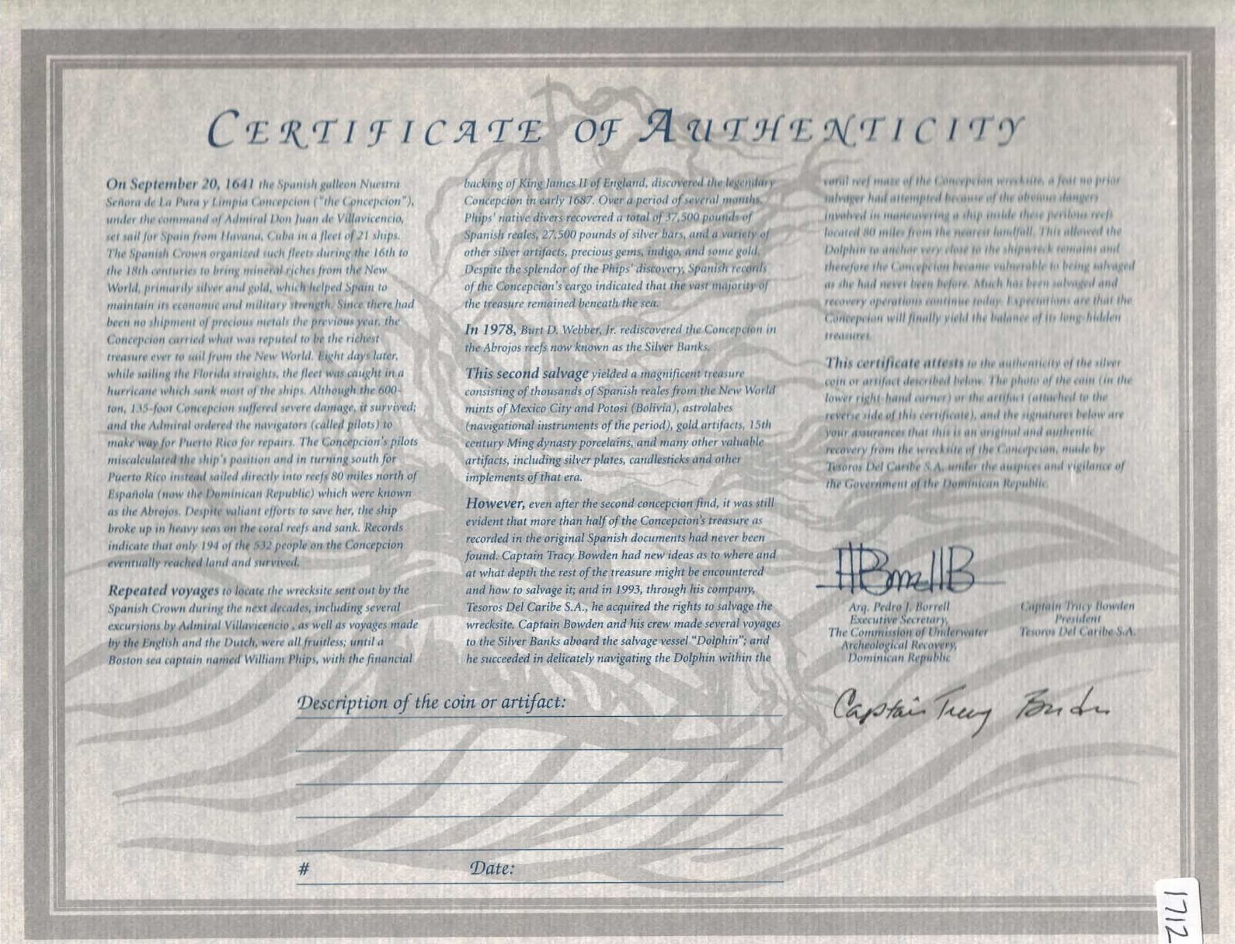 BOLIVIA, Potosí, cob 8 reales, Philip IV, assayer P (mid-1620s), quadrants of cross transposed. S-P23; KM-19; Cal-Type 327. 25.00 grams. Clear P•P to left of nearly complete shield, partial cross with some doubling, struck on an irregular planchet, silvery surfaces with very minimal corrosion. With original certificate from Captain Tracy Bowden through his contract with the Dominican Republic. Recovered from: Concepción, sunk in 1641 off Hispaniola