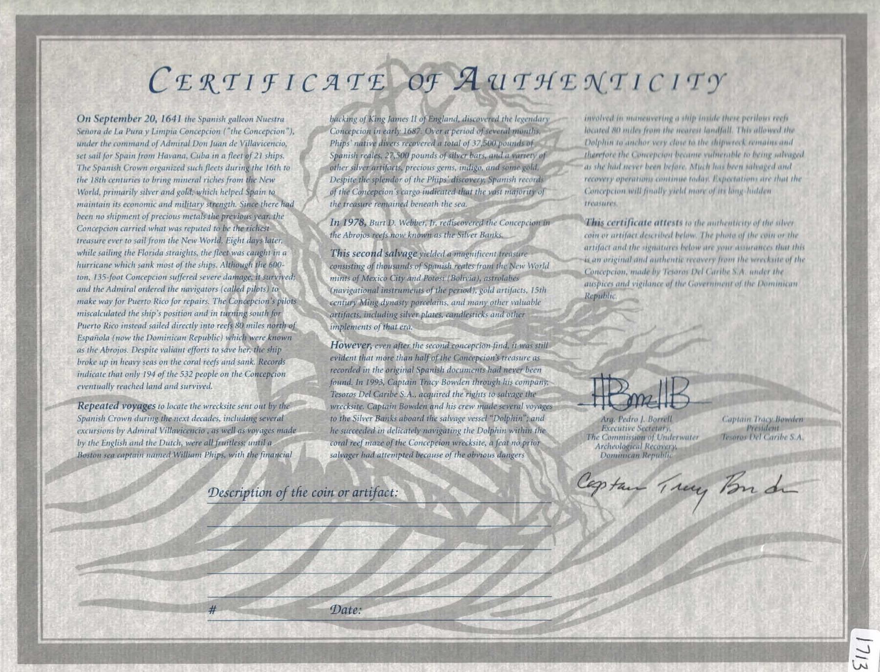 BOLIVIA, Potosí, cob 8 reales, Philip IV, assayer P (mid-1620s), quadrants of cross transposed. S-P23; KM-19; Cal-Type 327. 23.70 grams. Nice, solid example with bold full shield and cross (both exhibiting some doubling), clear mintmark and assayer, only minor surface corrosion. With original certificate from Captain Tracy Bowden through his contract with the Dominican Republic. Recovered from: Concepción, sunk in 1641 off Hispaniola