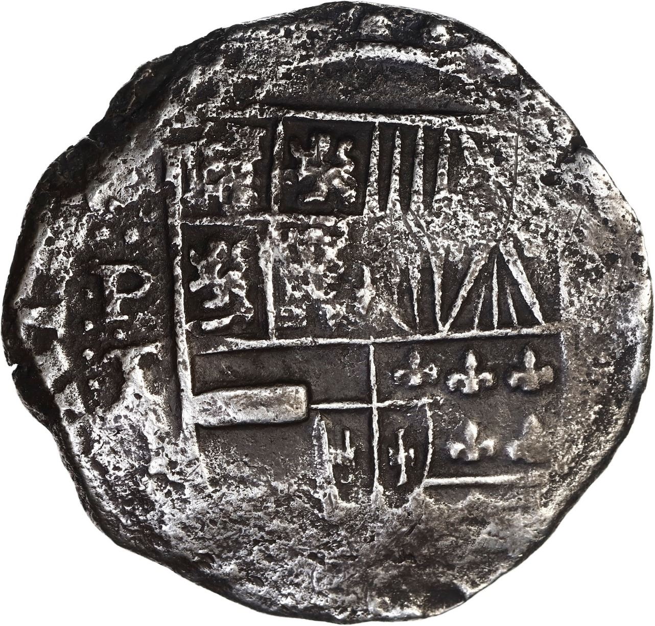 BOLIVIA, Potosí, cob 8 reales, Philip IV, assayer T (1630s). S-P26; KM-19a; Cal-Type 327. 23.30 grams. Full cross-lions-castles, well-detailed full shield with full •P•T to left, toned all over, light to moderate corrosion. With original certificate from Captain Tracy Bowden through his contract with the Dominican Republic. Recovered from: Concepción, sunk in 1641 off Hispaniola