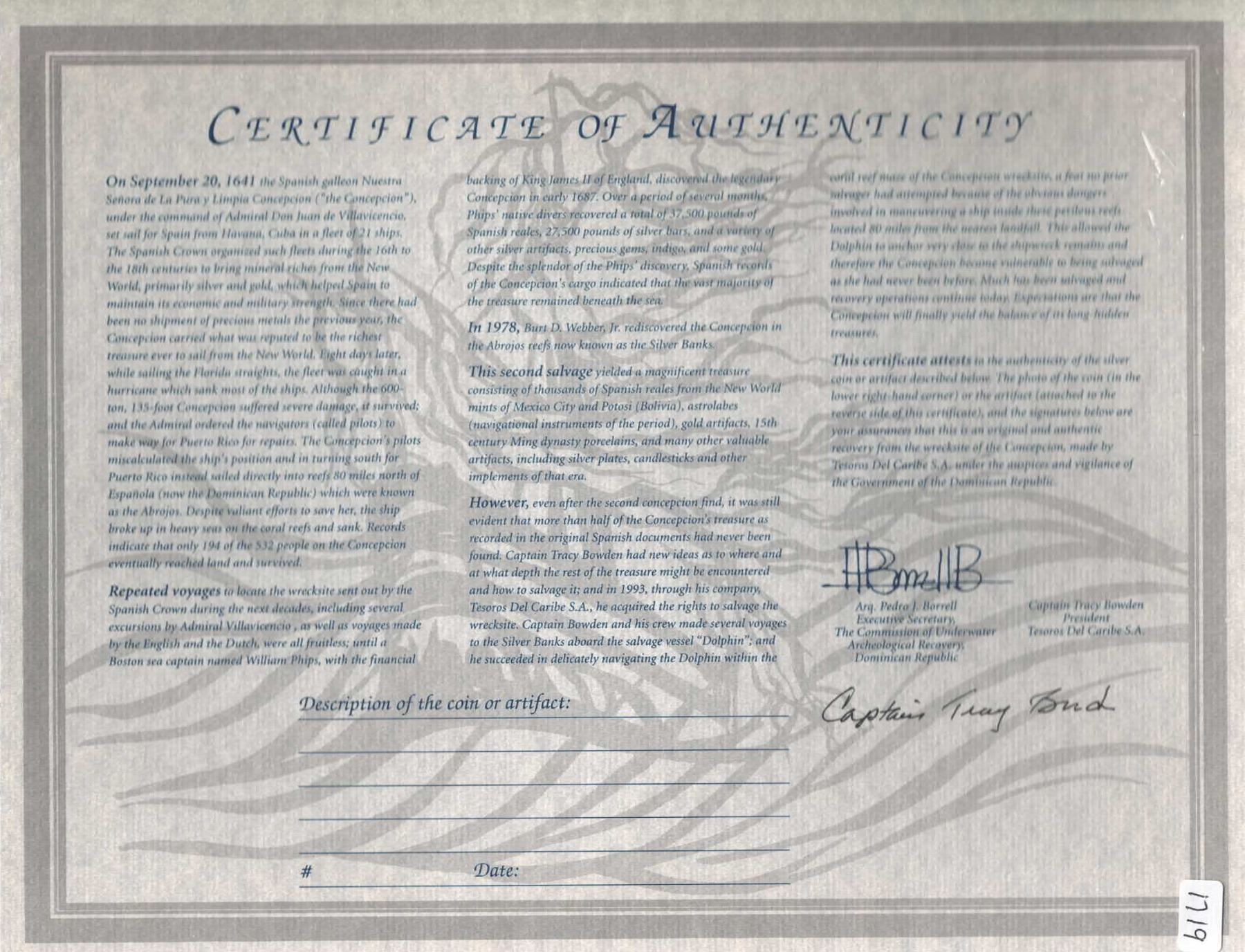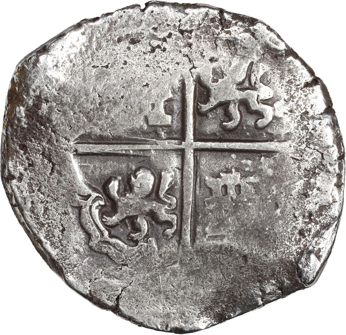 BOLIVIA, Potosí, cob 8 reales, Philip IV, assayer T (1630s). S-P26; KM-19a; Cal-Type 327. 25.13 grams. Detailed partial shield and cross with flat peripheries, weak but certain assayer, mild surface corrosion. With original certificate from Captain Tracy Bowden through his contract with the Dominican Republic. Recovered from: Concepción, sunk in 1641 off Hispaniola