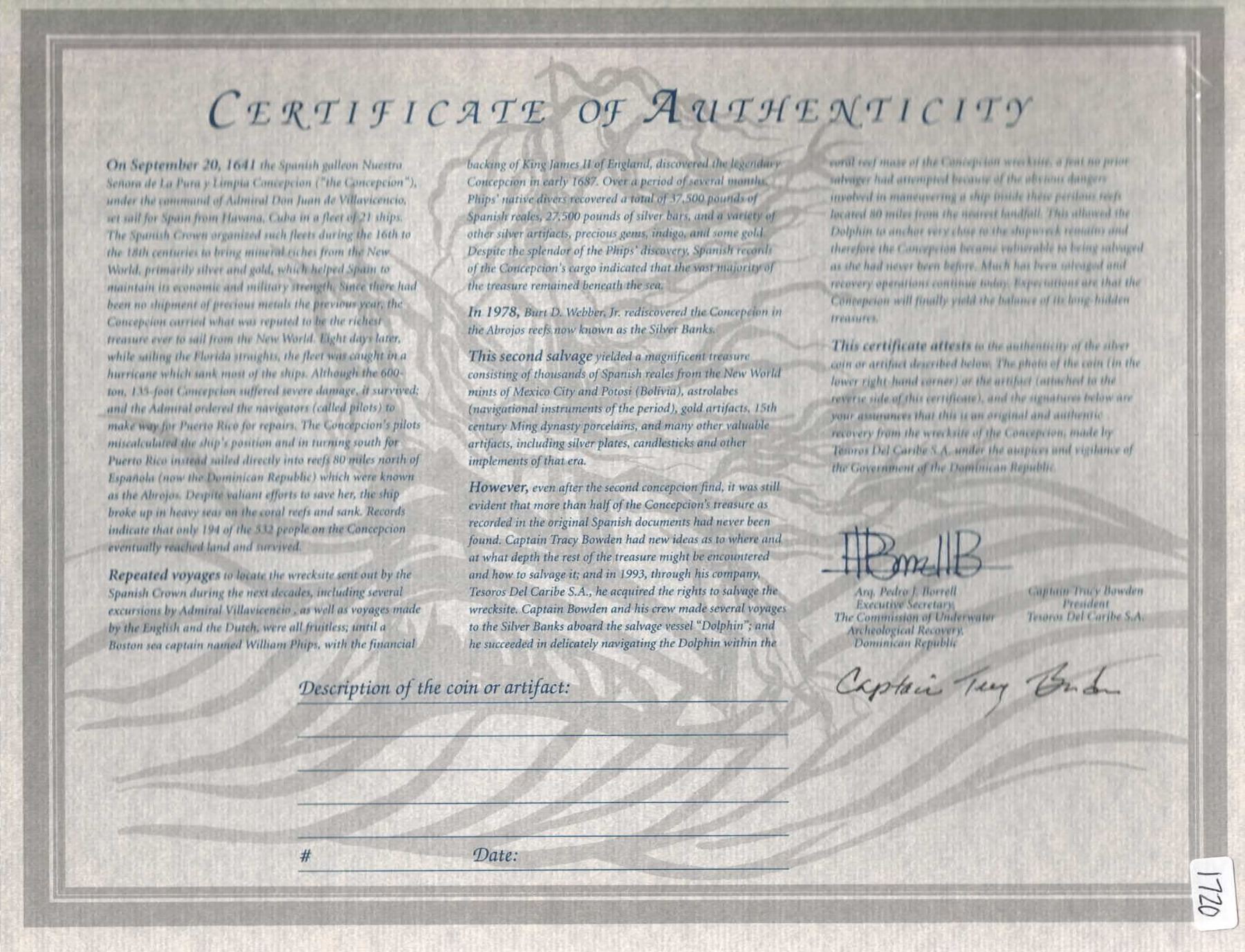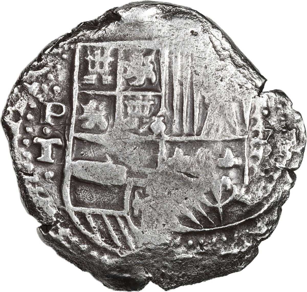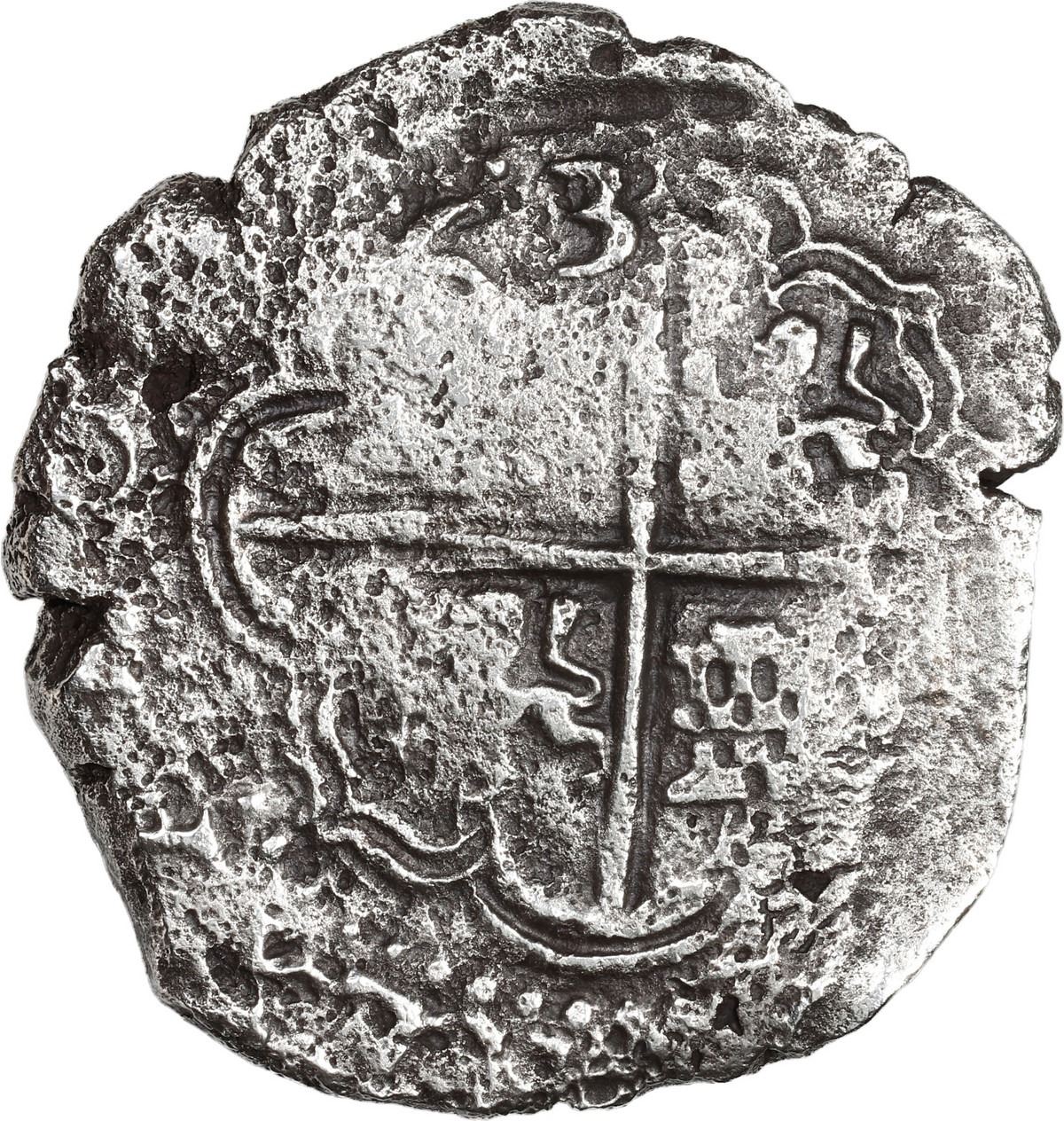 BOLIVIA, Potosí, cob 8 reales, Philip IV, assayer T (1630s). S-P26; KM-19a; Cal-Type 327. 22.62 grams. Bold mintmark and assayer to left of doubled shield, partial cross with strong 63 of date visible at top from doubling. With original certificate from Captain Tracy Bowden through his contract with the Dominican Republic. Recovered from: Concepción, sunk in 1641 off Hispaniola