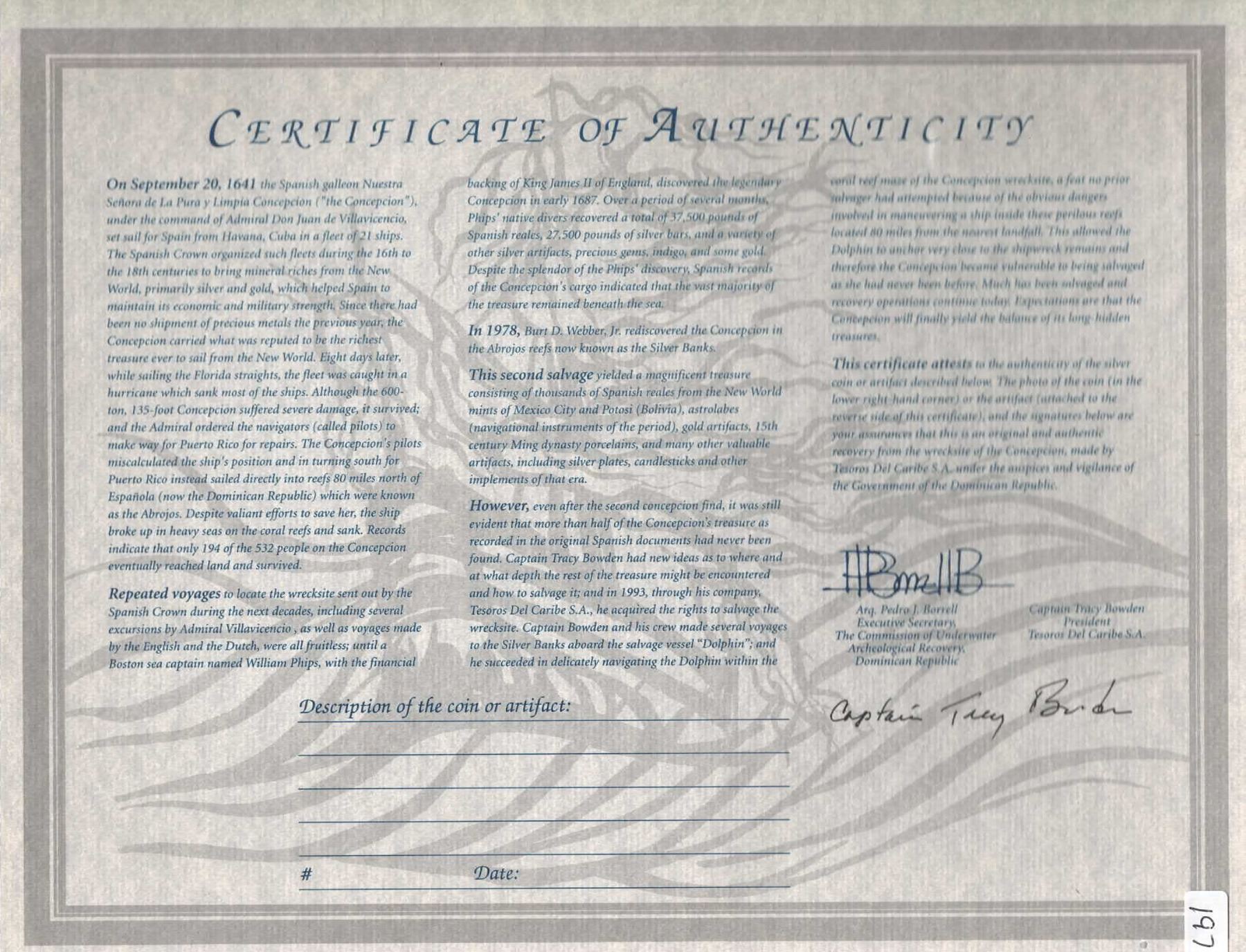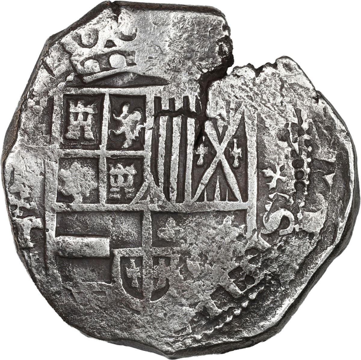 BOLIVIA, Potosí, cob 8 reales, Philip IV, assayer T (early 1630s), with cross-fleury ornaments. S-P26; KM-19a; Cal-Type 327. 26.38 grams. Full but doubled cross, nice full shield with clear mintmark-assayer showing a cross-fleury ornament between the P and T, the same ornament boldly visible above the denomination to the left, nicely toned with minimal surface corrosion, deep edge-crack. With original certificate from Captain Tracy Bowden through his contract with the Dominican Republic. Recovered from: Concepción, sunk in 1641 off Hispaniola