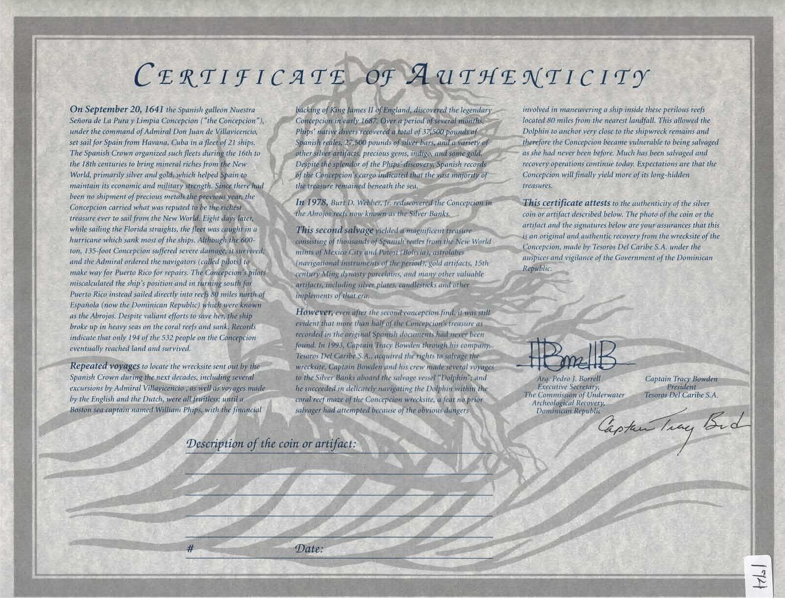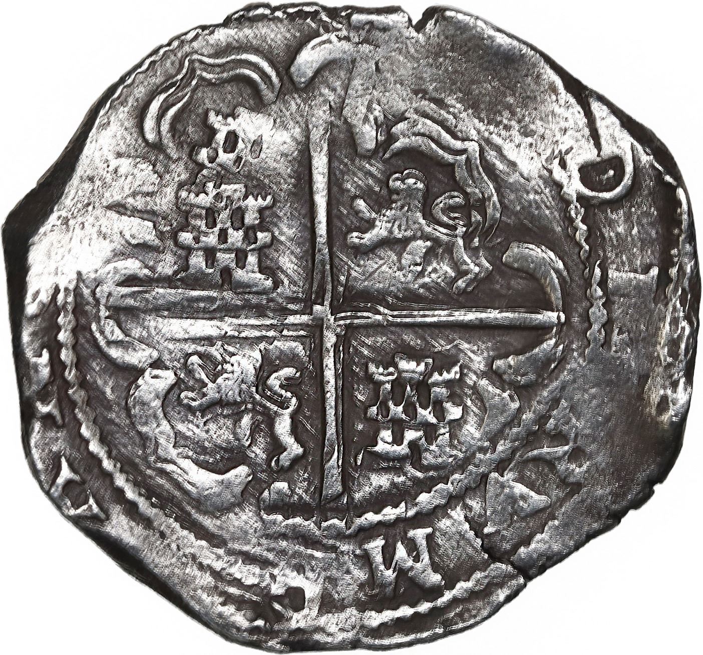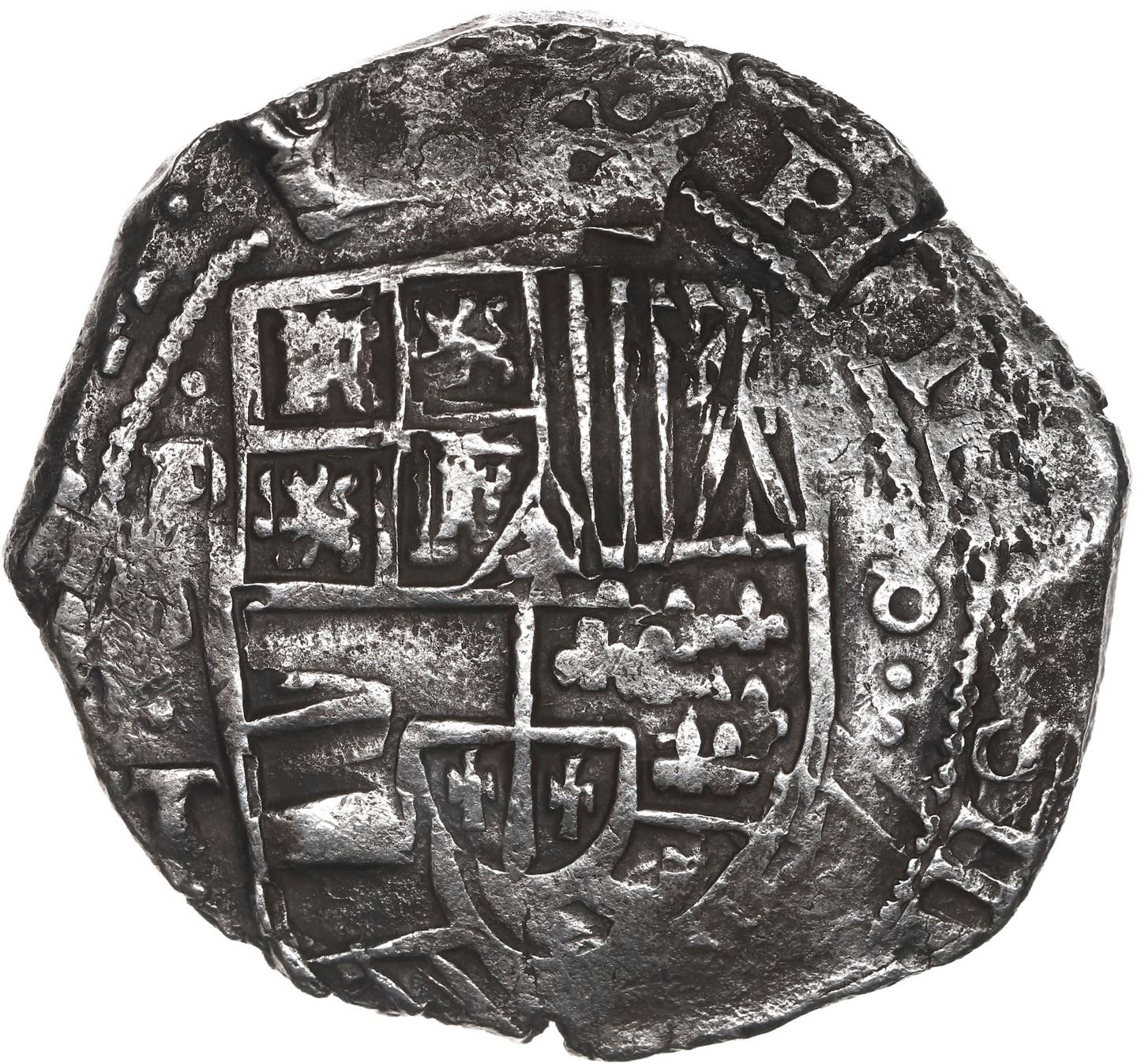 BOLIVIA, Potosí, cob 8 reales, Philip IV, assayer T (early 1630s). KM-19a; Cal-Type 327. 26.82 grams. Bold full shield and cross (both slightly doubled) with parts of legend including king's name and ordinal but without a visible date, full mintmark-assayer, no corrosion, elegantly toned, hairline edge-split. With original certificate from Captain Tracy Bowden through his contract with the Dominican Republic. Recovered from: Concepción, sunk in 1641 off Hispaniola