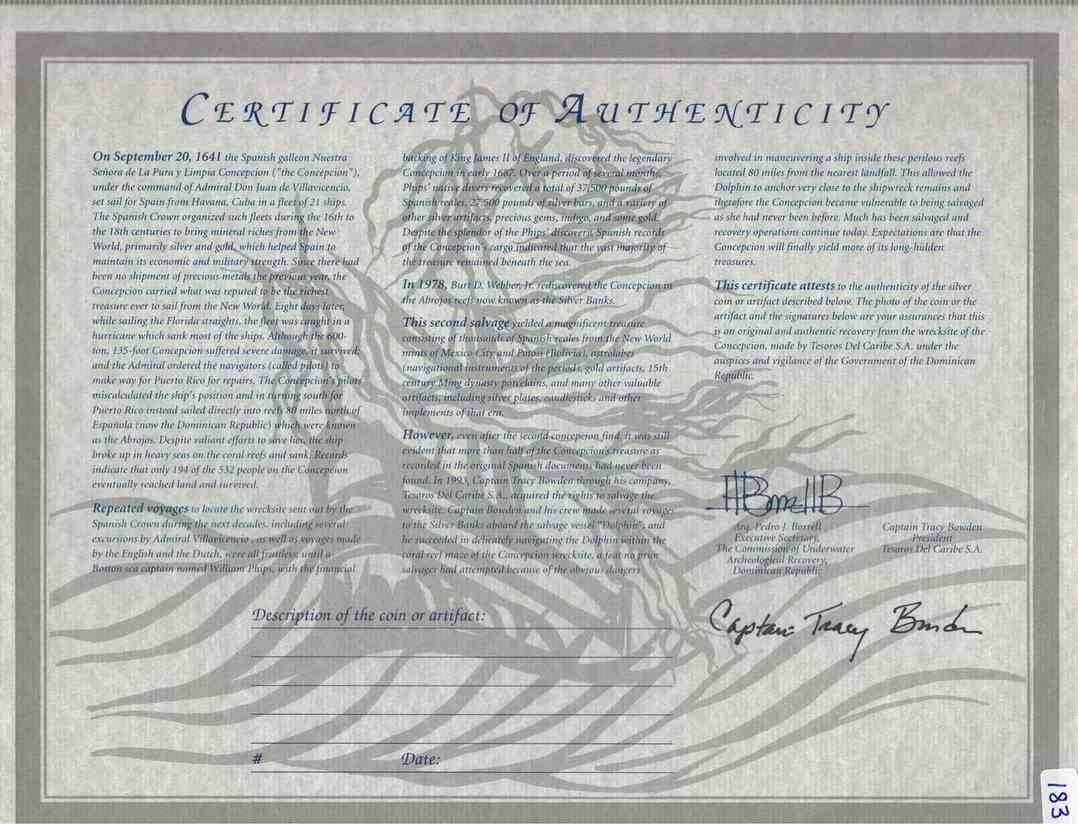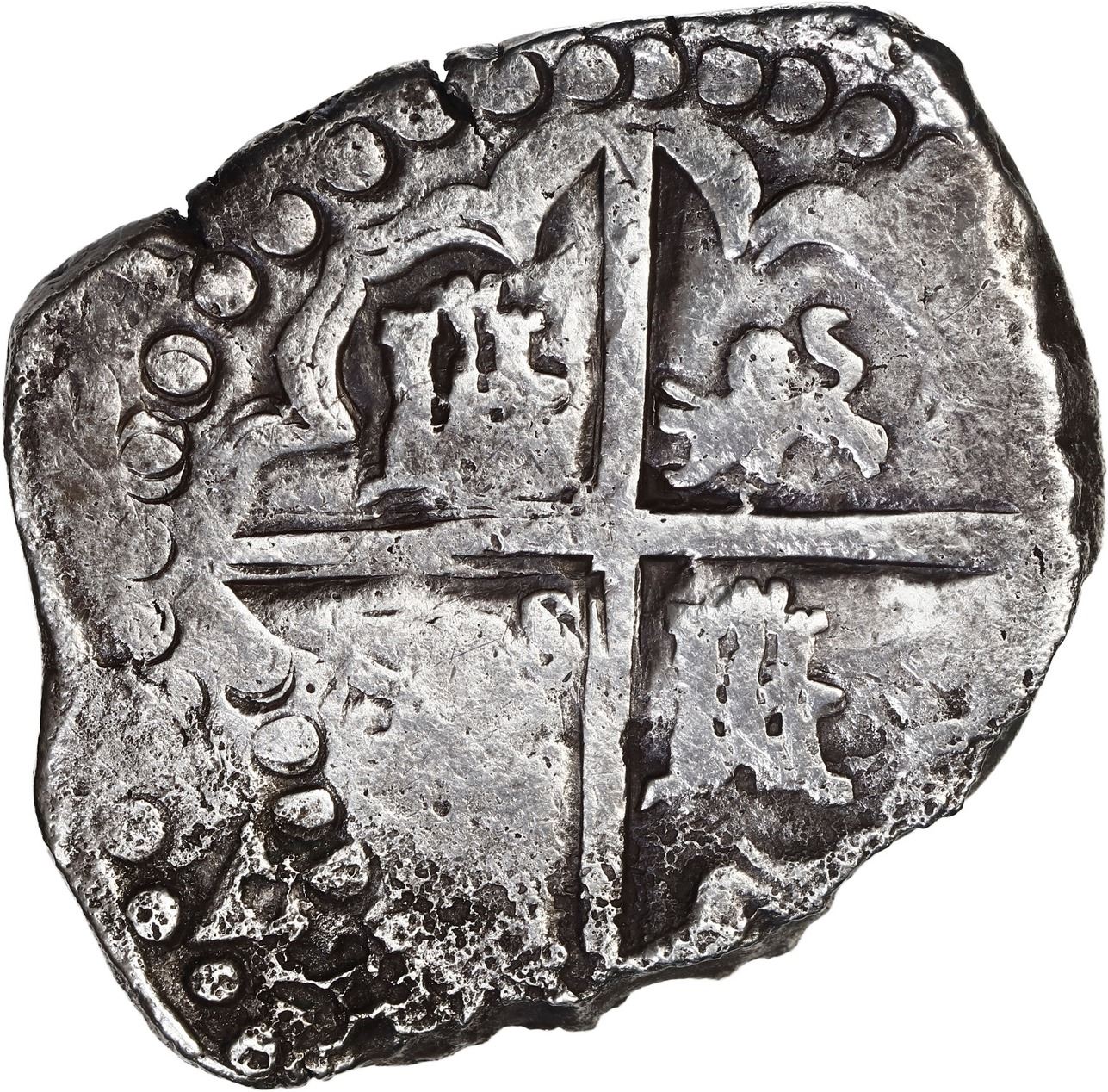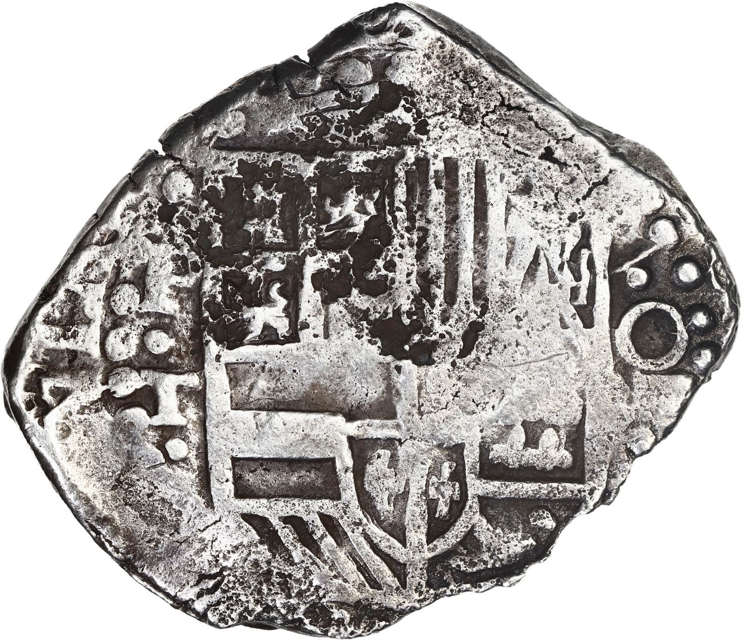 BOLIVIA, Potosí, cob 8 reales, Philip IV, assayer T (late 1620s), "flat" lions. S-P26; KM-19a; Cal-Type 327. 24.45 grams. Full shield and cross on an oddly rectangular flan with some edge corrosion, full P•T•, toned on fields. With original certificate from Captain Tracy Bowden through his contract with the Dominican Republic. Recovered from: Concepción, sunk in 1641 off Hispaniola