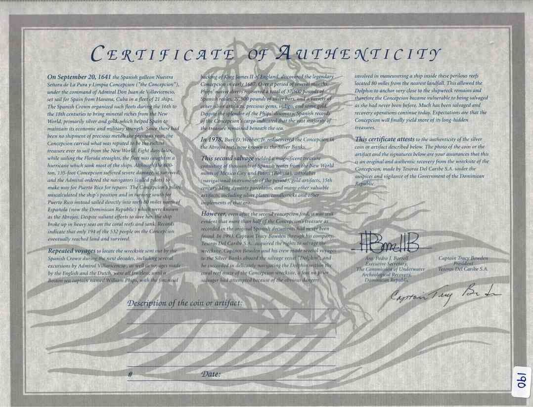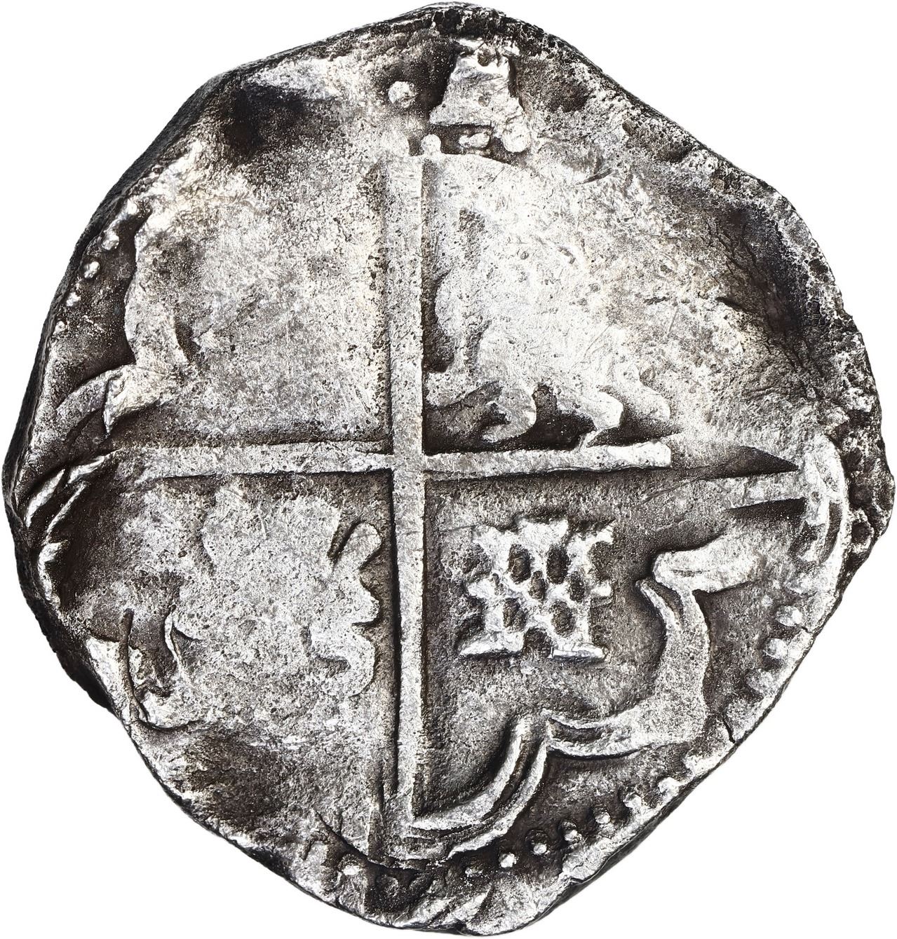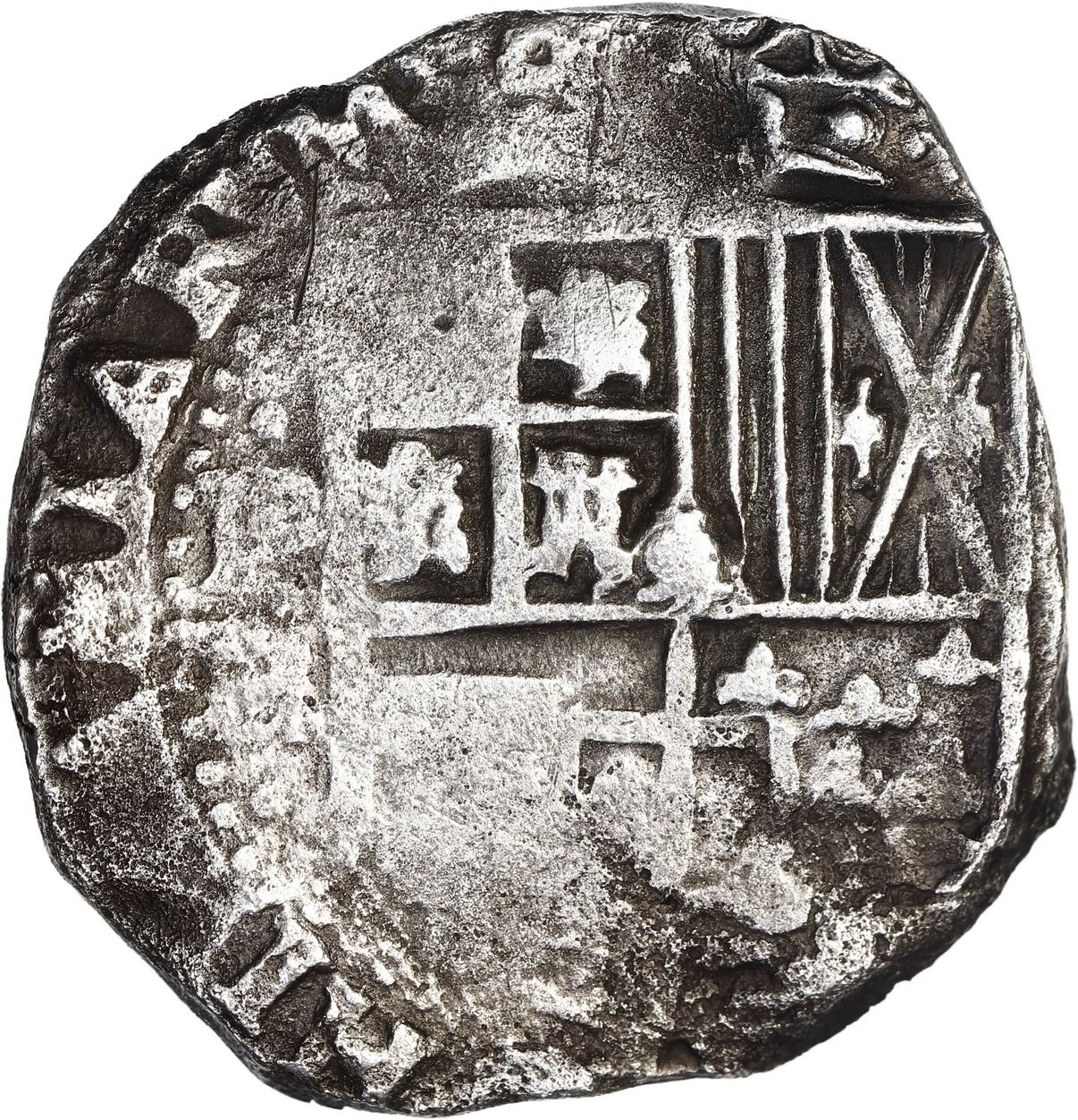 BOLIVIA, Potosí, cob 8 reales, Philip IV, assayer TR (1630s). S-P27; KM-19a; Cal-Type 327. 25.32 grams. Nearly full shield and cross with some flat spots due to typical uneven thickness, light surface corrosion, toned in crevices. With original certificate from Captain Tracy Bowden through his contract with the Dominican Republic. Recovered from: Concepción, sunk in 1641 off Hispaniola
