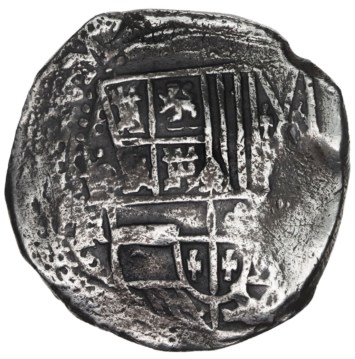 BOLIVIA, Potosí, cob 8 reales, Philip IV, assayer TR (large, late 1630s). S-P27; KM-19a; Cal-Type 327. 26.22 grams. Good full cross (slightly doubled at upper left), full shield (also slightly doubled) with flat spot to right where flan dips, minimal corrosion, light gunmetal toning all over. With original certificate from Captain Tracy Bowden through his Concepción contract with the Dominican Republic. Recovered from: Concepción, sunk in 1641 off Hispaniola