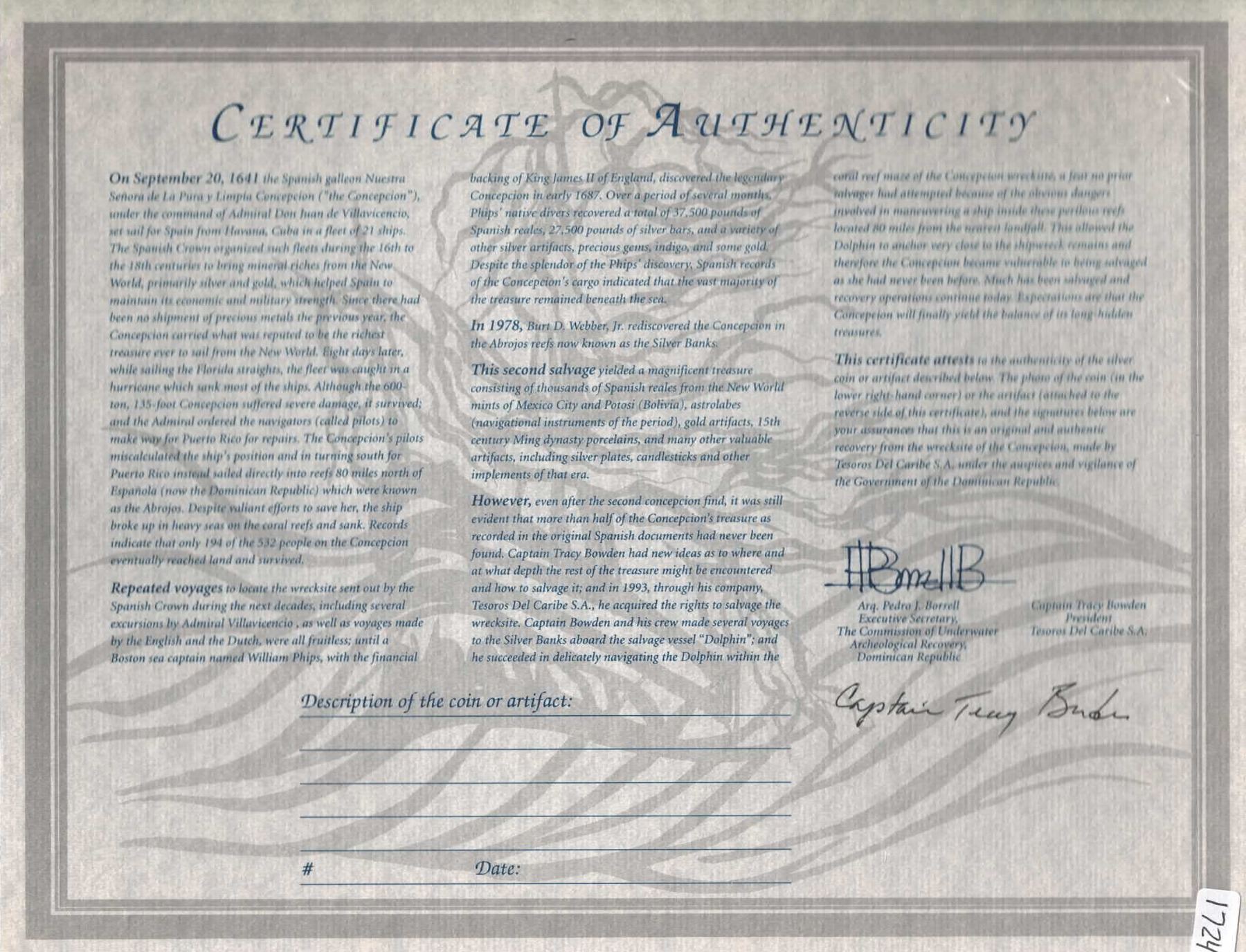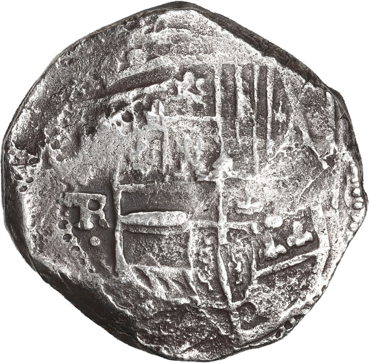 BOLIVIA, Potosí, cob 8 reales, Philip IV, assayer TR (late 1630s). S-P27; KM-19a; Cal-Type 327. 27.03 grams. Nice cross with bold lions if a bit doubled, decent shield (again, doubled) with clear assayer, light surface corrosion. With original certificate from Captain Tracy Bowden through his contract with the Dominican Republic. Recovered from: Concepción, sunk in 1641 off Hispaniola