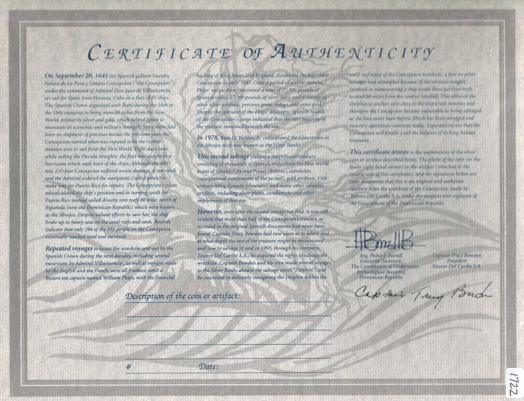 BOLIVIA, Potosí, cob 8 reales, Philip IV, assayer TR (mid- to late 1630s). S-P27; KM-19a; Cal-Type 327. 26.18 grams. Solid and thick piece with nearly complete shield and cross, clear mintmark and assayer, very minor surface corrosion. With original certificate from Captain Tracy Bowden through his contract with the Dominican Republic. Recovered from: Concepción, sunk in 1641 off Hispaniola