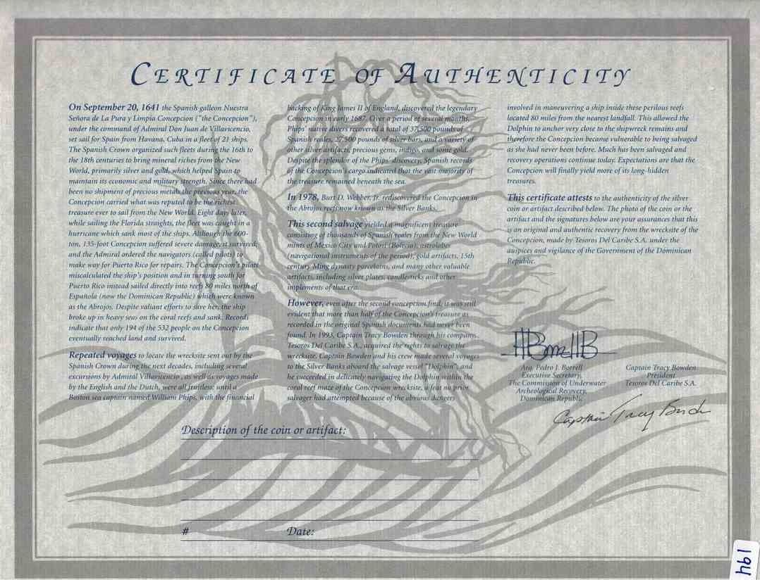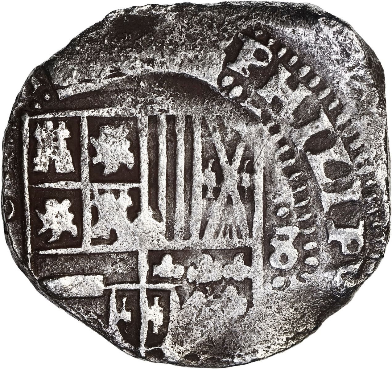 BOLIVIA, Potosí, cob 8 reales, Philip IV, assayer not visible (1630s). KM-19a; Cal-Type 327. 23.25 grams. Nice but off-center shield with full denomination 8 to right inside very bold full PHILIPV(S), the cross also full but off-center, some corrosion, toned on fields. With original certificate from Captain Tracy Bowden through his contract with the Dominican Republic. Recovered from: Concepción, sunk in 1641 off Hispaniola