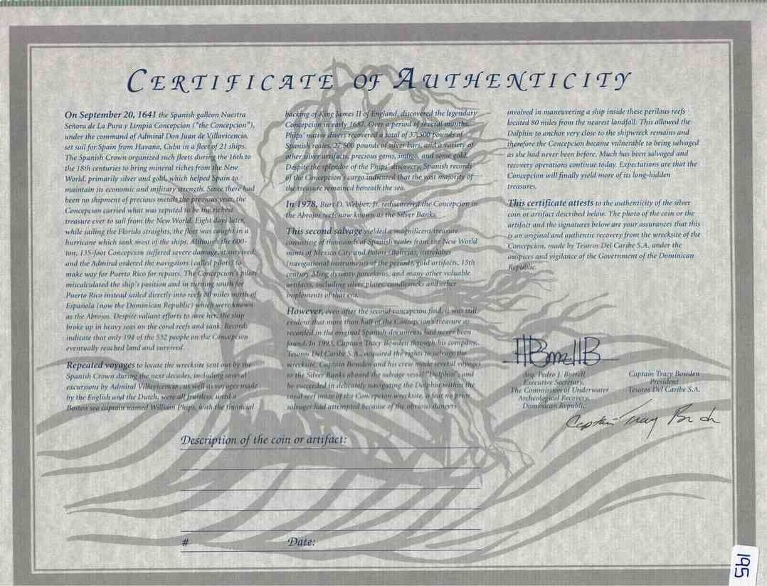 BOLIVIA, Potosí, cob 8 reales, Philip IV, assayer not visible (1630s). KM-19a; Cal-Type 327. 25.06 grams. Bold full cross-lions-castles, full and well-detailed but slightly doubled shield, lightly toned, light surface corrosion. With original certificate from Captain Tracy Bowden through his contract with the Dominican Republic. Recovered from: Concepción, sunk in 1641 off Hispaniola