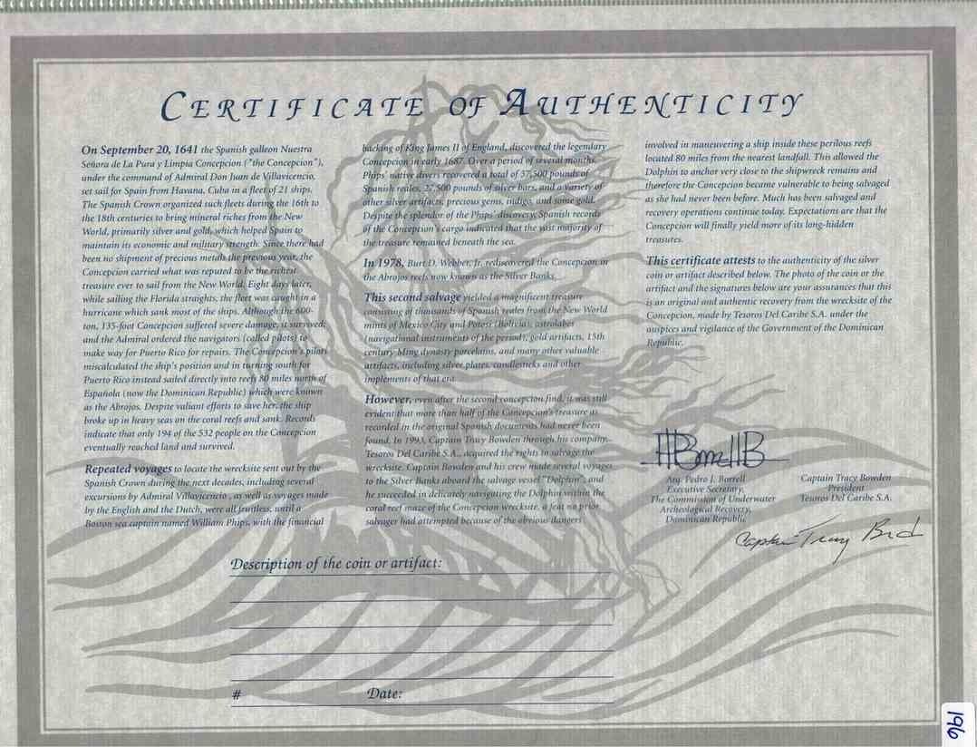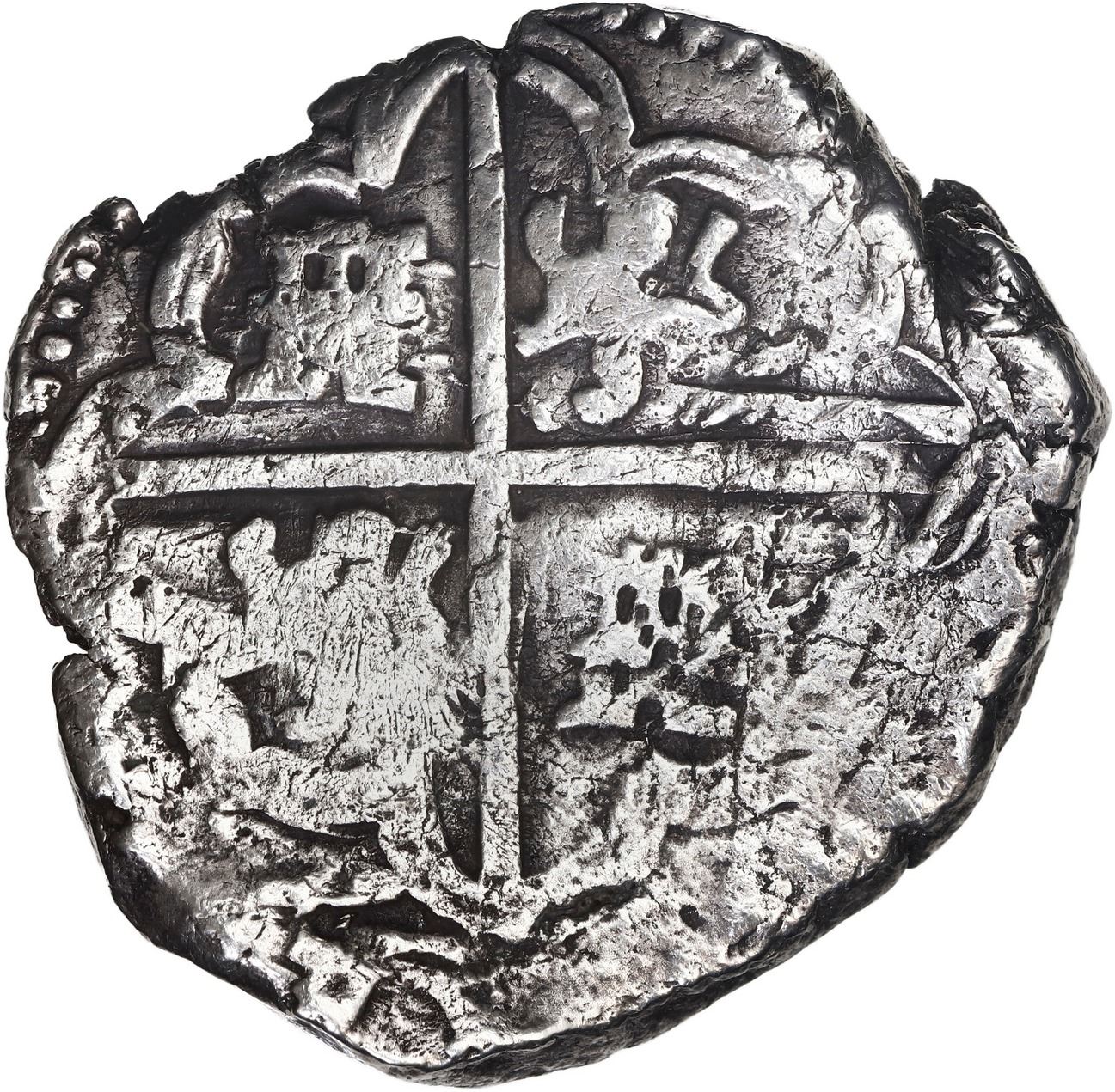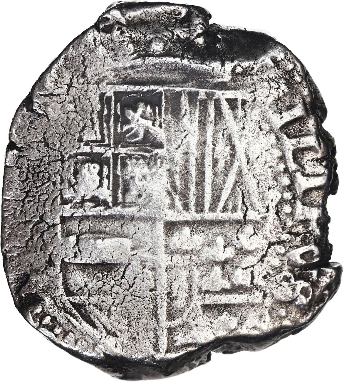 BOLIVIA, Potosí, cob 8 reales, Philip IV, assayer not visible (1630s). KM-19a; Cal-Type 327. 25.47 grams. Bold full cross, full shield with bold (P)HILIPVS in legend, thick flan with parts of edge crude (as made), some light corrosion, toned in crevices. With original certificate from Captain Tracy Bowden through his contract with the Dominican Republic. Recovered from: Concepción, sunk in 1641 off Hispaniola