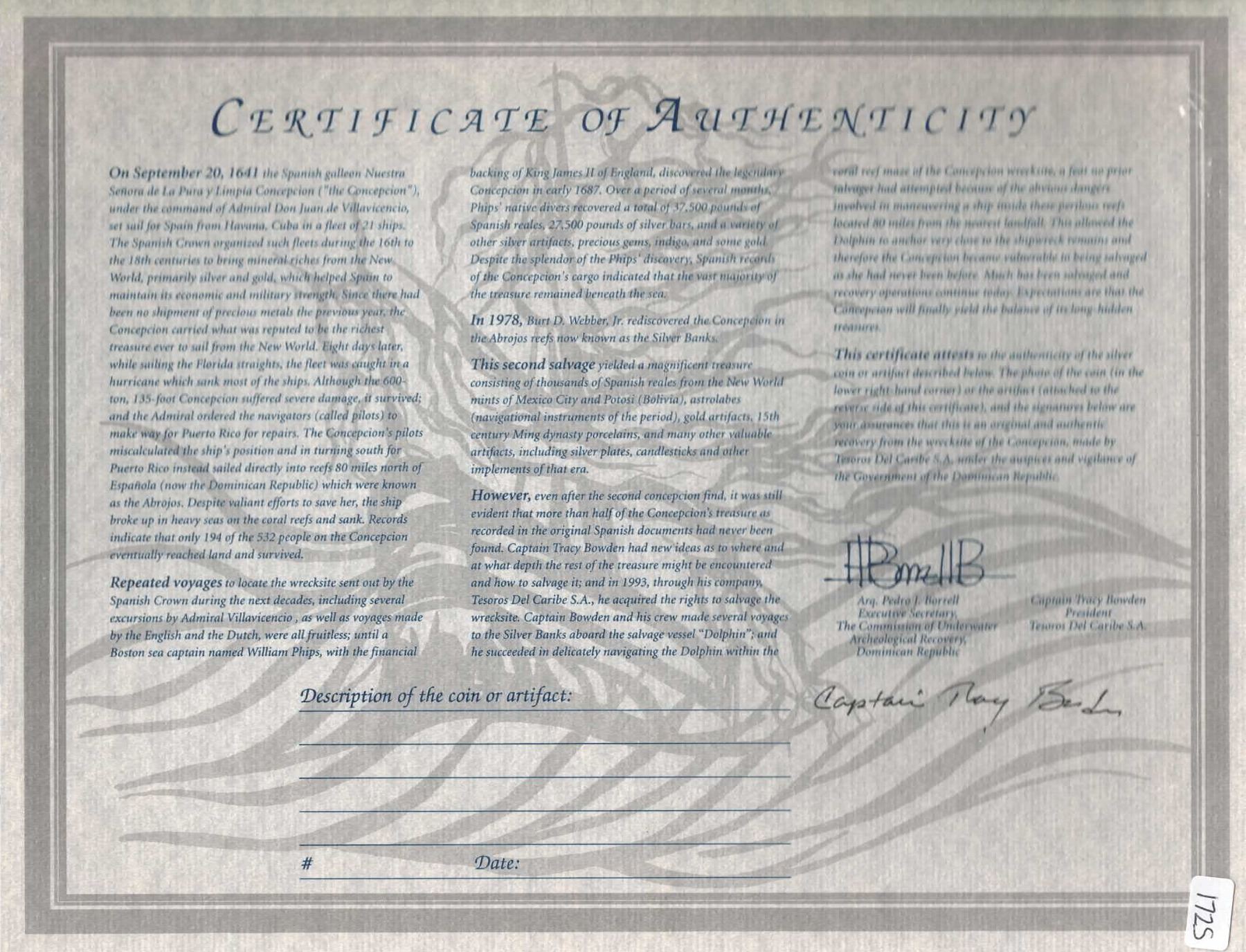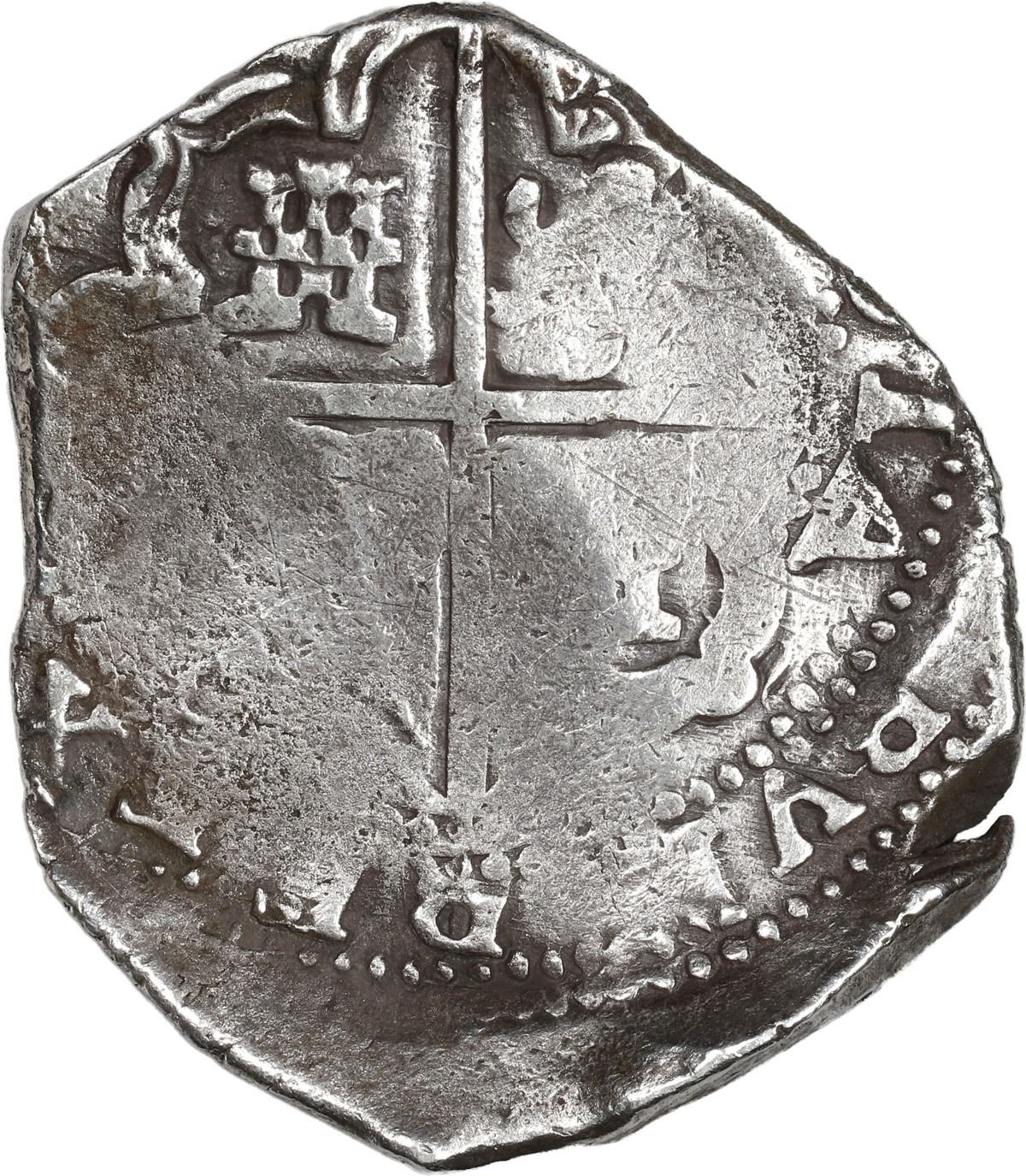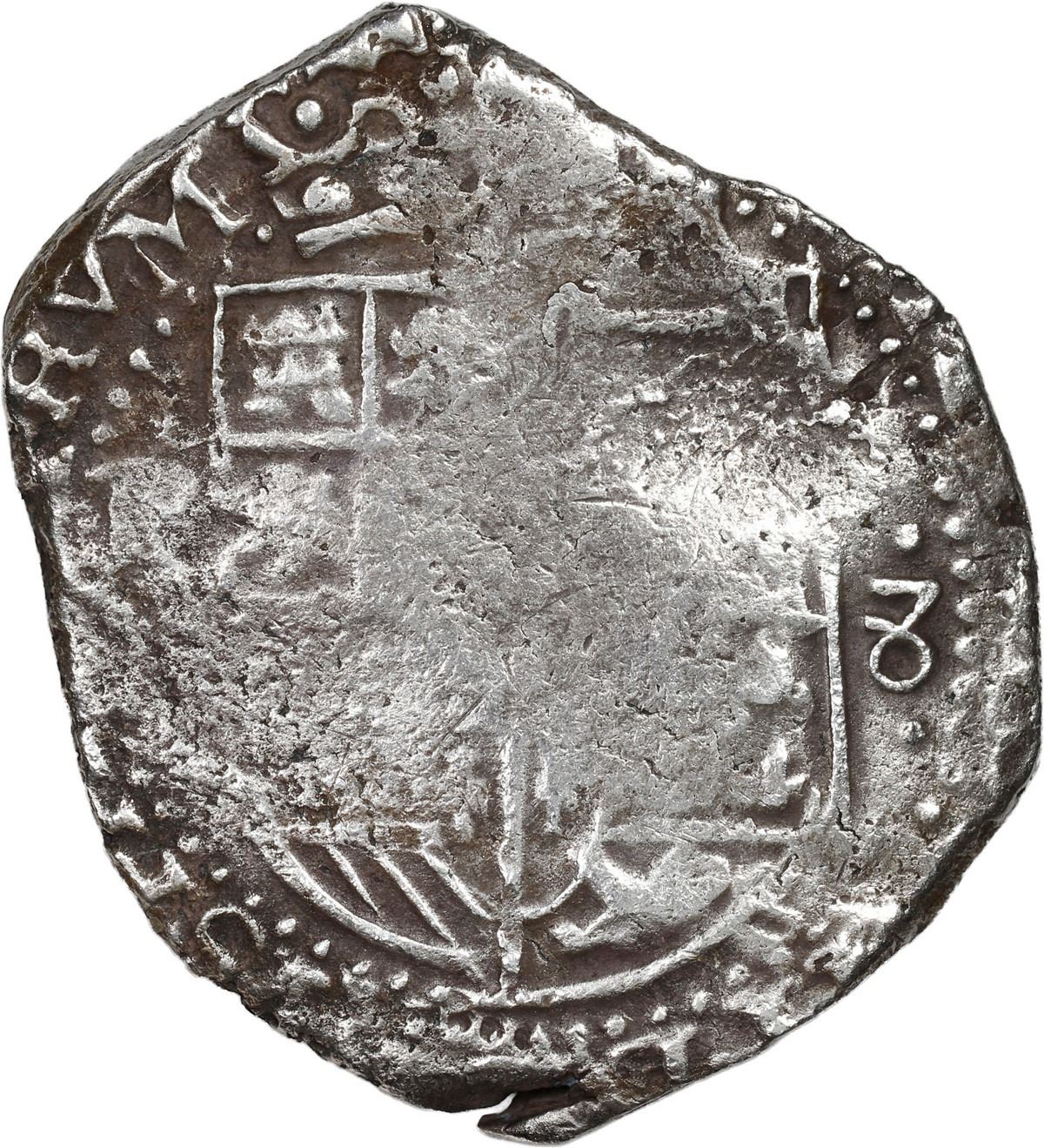 BOLIVIA, Potosí, cob 8 reales, Philip IV, assayer not visible (1630s). KM-19a; Cal-Type 327. 26.51 grams. Interesting piece as strongly struck on a crude planchet leaving some parts of nice sharp details including a fair amount of legend text (for instance, clear RVM = "RUM" above the shield), other areas struck a bit flat along with some doubling, small planchet-clip on edge as made, very little corrosion. With original certificate from Captain Tracy Bowden through his contract with the Dominican Republic. Recovered from: Concepción, sunk in 1641 off Hispaniola