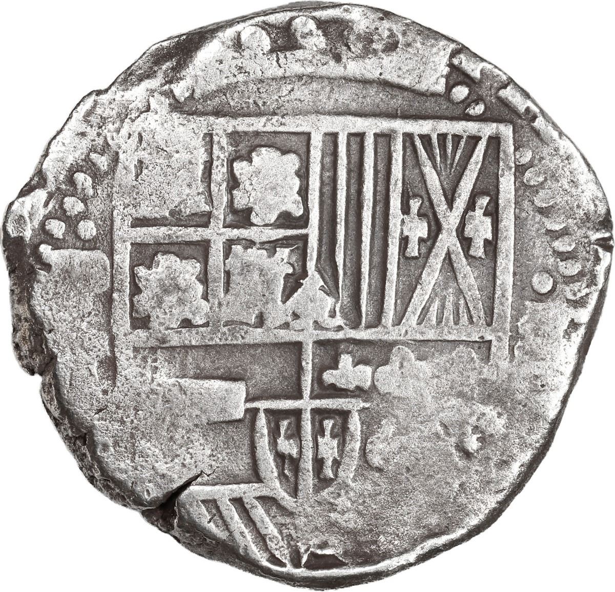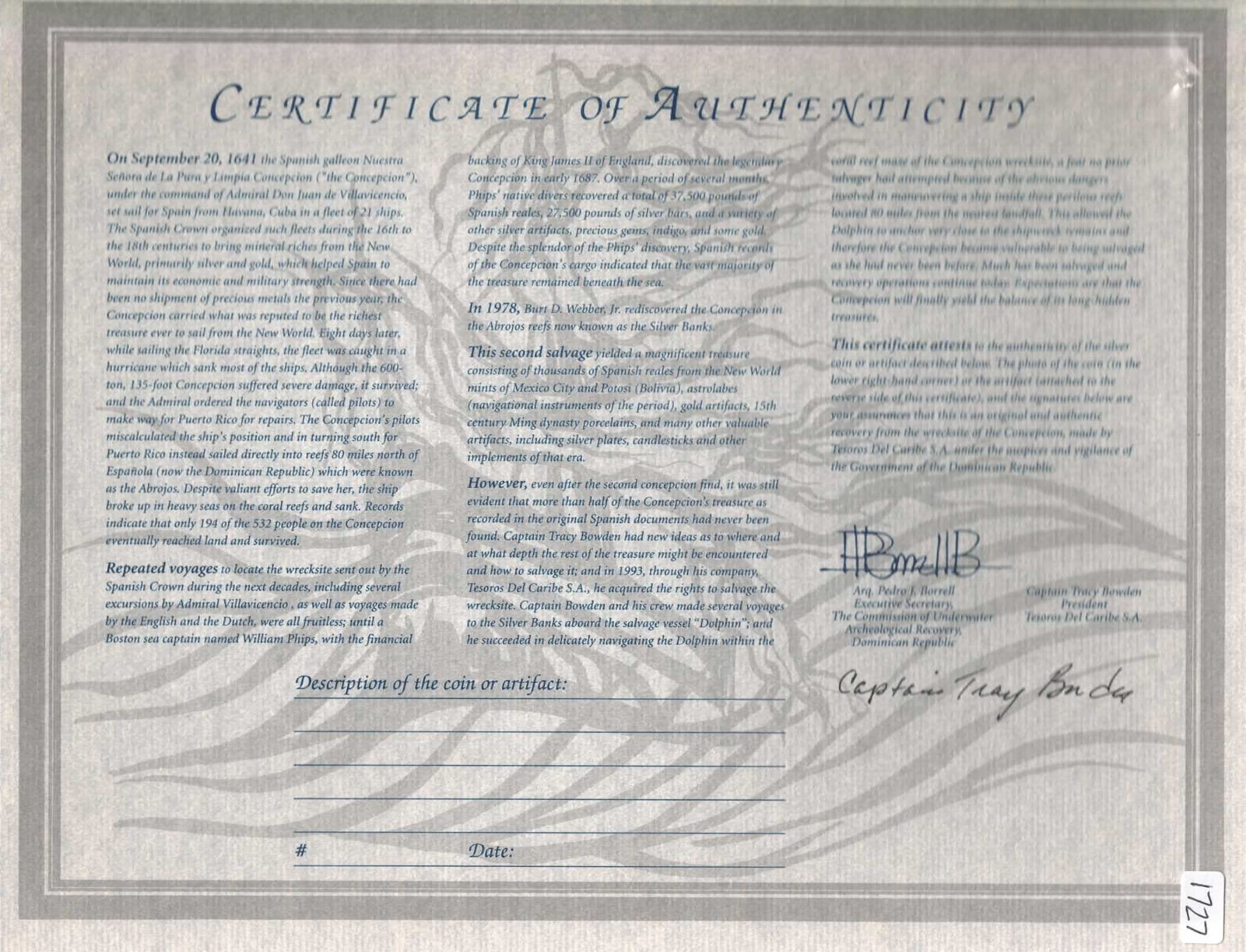 BOLIVIA, Potosí, cob 8 reales, Philip IV, assayer not visible (1630s). KM-19a; Cal-Type 327. 25.28 grams. Solid, thick piece with steely gray, lightly corroded surfaces, bold shield and very nice cross. With original certificate from Captain Tracy Bowden through his contract with the Dominican Republic. Recovered from: Concepción, sunk in 1641 off Hispaniola