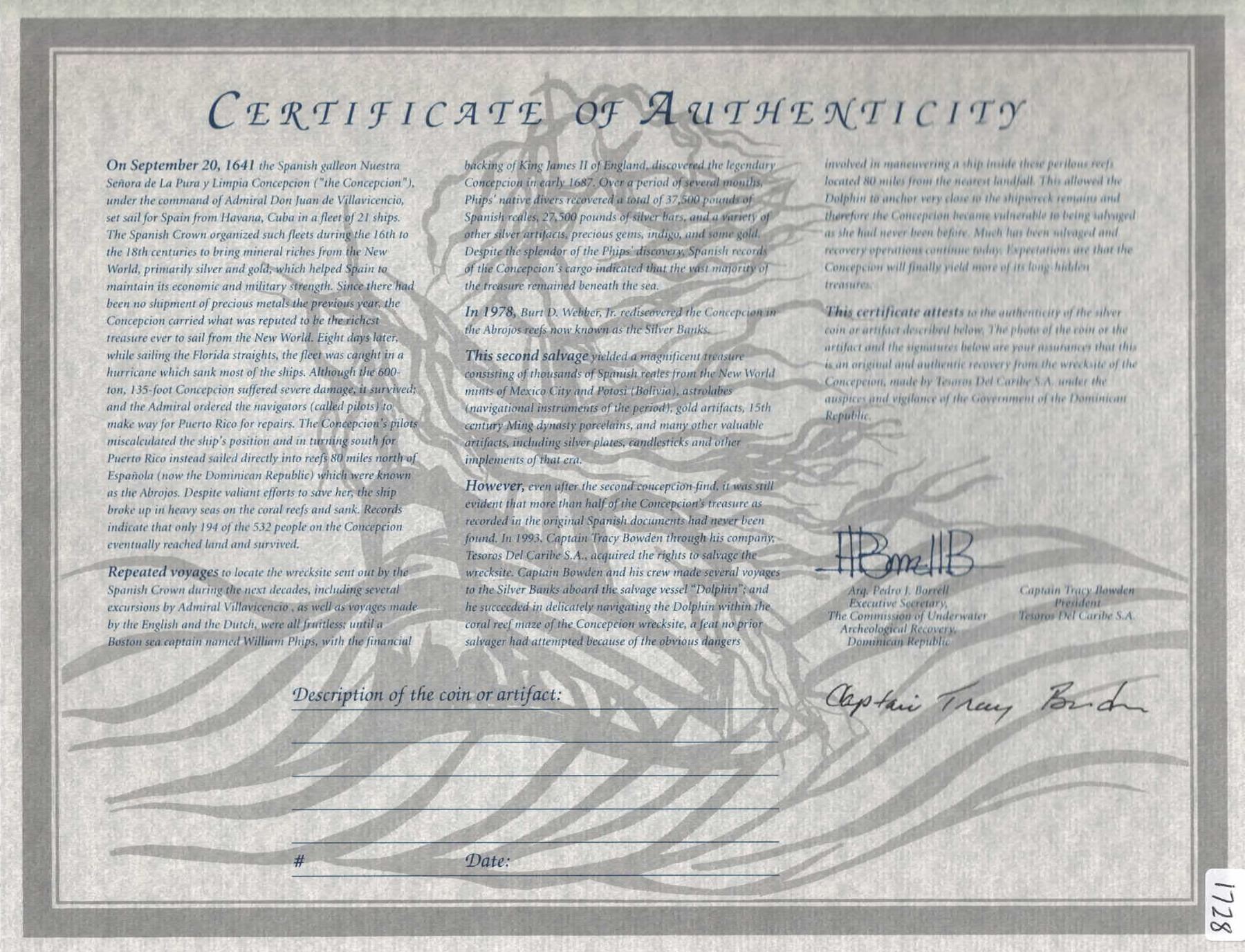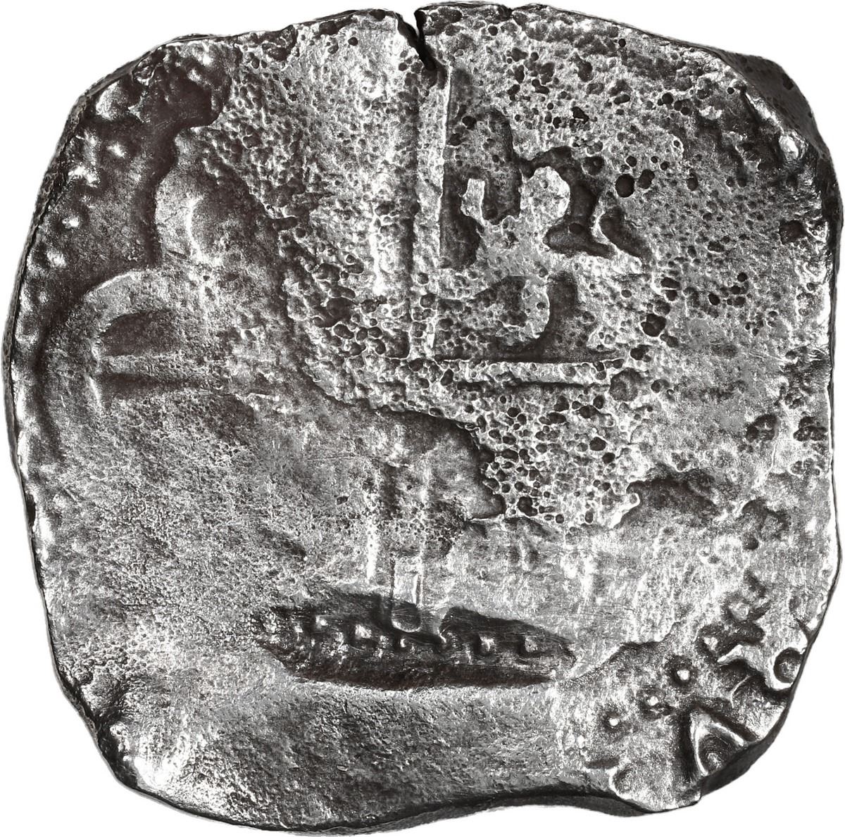 BOLIVIA, Potosí, cob 8 reales, Philip IV, assayer not visible (1630s). KM-19a; Cal-Type 327. 20.87 grams. Corroded piece with some shield and cross detail on this crude planchet, clear mintmark though assayer not certain (probably T), some legend detail including bottom part of 6 in date. With original certificate from Captain Tracy Bowden through his contract with the Dominican Republic. Recovered from: Concepción, sunk in 1641 off Hispaniola