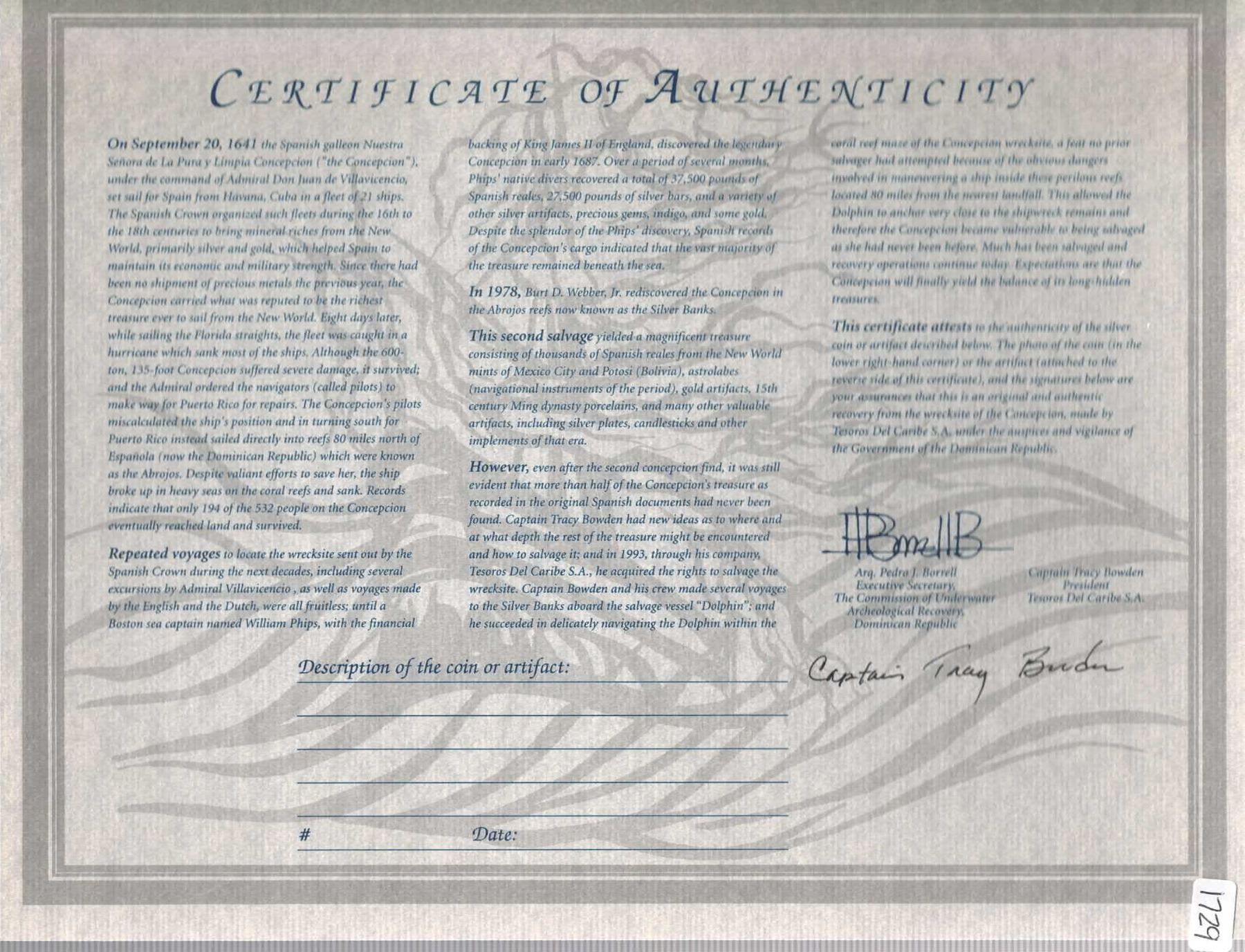 BOLIVIA, Potosí, cob 8 reales, Philip IV, assayer not visible (1630s). KM-19a; Cal-Type 327. 22.33 grams. Corroded along the edge and rather smooth though with some decent shield and cross detail. With original certificate from Captain Tracy Bowden through his contract with the Dominican Republic. Recovered from: Concepción, sunk in 1641 off Hispaniola