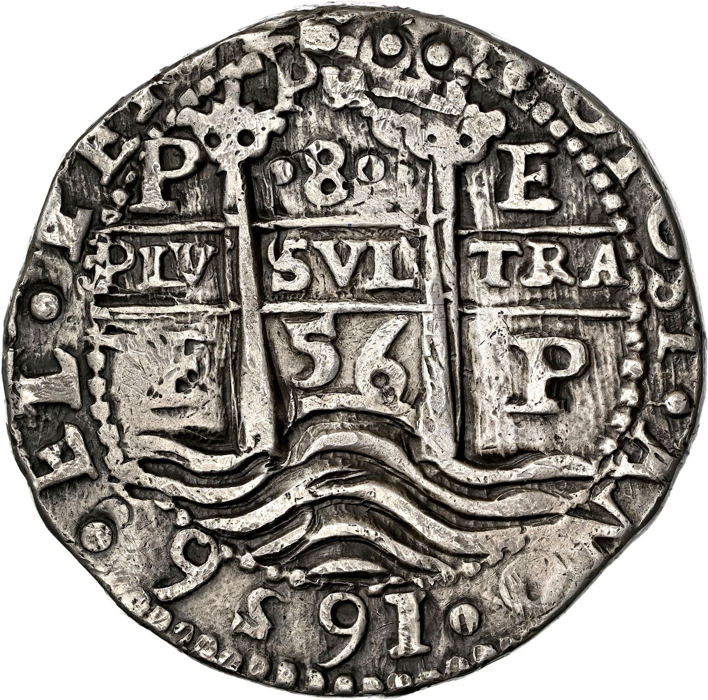 BOLIVIA, Potosí, cob 8 reales Royal (galano), 1656 E, PH at top, pomegranate above cross, rare. S-P37a; KM-R21; Cal-1416. 27.43 grams. Choice bold details, especially the legend date (albeit tooled) due to slightly off-center pillars side (an unrecorded die, the cross side a die-match with Lázaro-146, rated R2), contrastingly toned XF+ with expertly repaired hole at edge on left side of crown above cross.