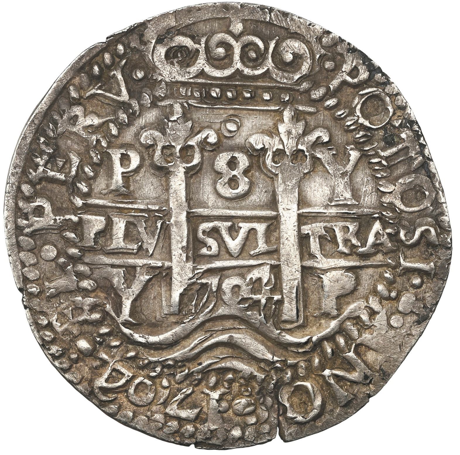 BOLIVIA, Potosí, cob 8 reales Royal (galano), 1704/3 Y, rare, NGC AU 55, finest known in NGC census. S-P43a; KM-unl (R31 for type); Cal-unl (Type 174). 26.47 grams. Very broad flan (extending past the design in places) with superb full pillars side showing a bold 4/3 overdate in legend, the cross side also choice but slightly doubled and without a clear overdate, beautifully toned all over and the best example we know of. As expected, the cross side is a die-match with Lázaro 243, but the pillars side is not, hence the overdate is unlisted.