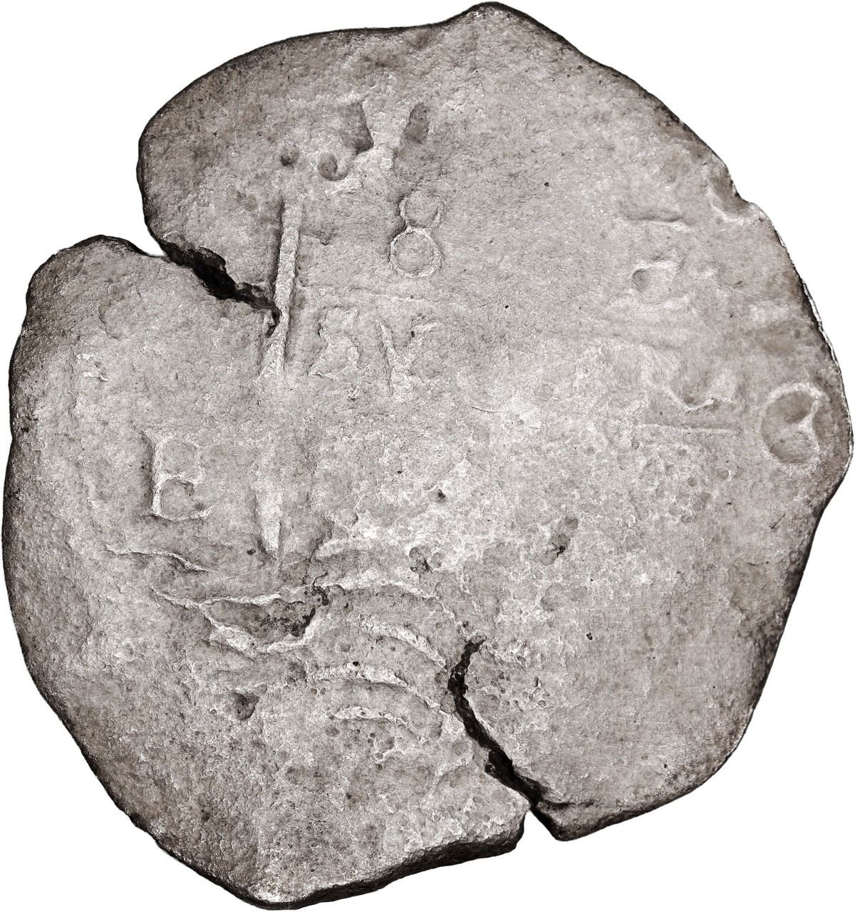 BOLIVIA, Potosí, cob 8 reales, date not visible (1660s), assayer E. 17.08 grams. Broad piece with matte, dull gray surfaces from saltwater corrosion, some pillars and cross detail with visible assayer though date not clear (1660s), two natural edge-cracks. Recovered from: Consolación, sunk in 1681 off Santa Clara Island, Ecuador