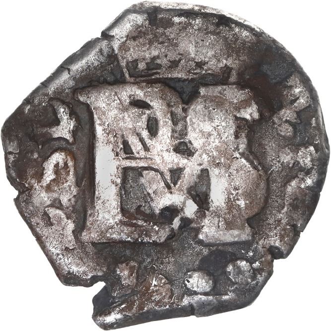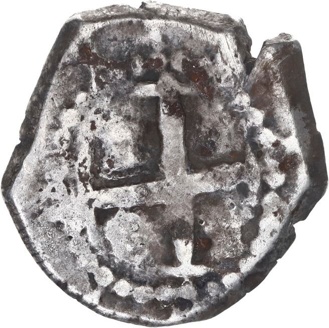 BOLIVIA, Potosí, cob ½ real, Philip IV, no assayer, nonsense lettering in legend, struck on a 1R planchet. 3.40 grams. Very interesting piece with ½R design struck on a 1R-weight planchet with bold full monogram and part of the legend showing nonsensical lettering, nice full cross, some brown encrustation spots here and there.