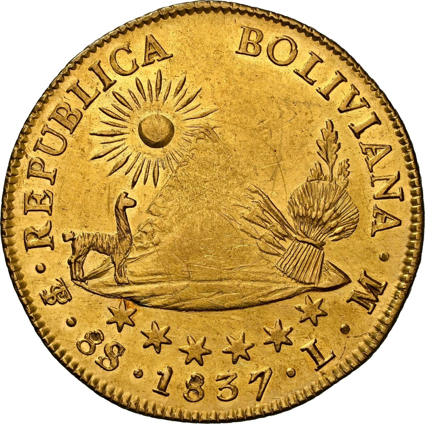 BOLIVIA, Potosí, gold 8 scudos, 1837 LM, NGC UNC details / rev graffiti. KM-99; Fr-21. Brilliant, Mint State details with surface hairlines, a few light scratches on the reverse.