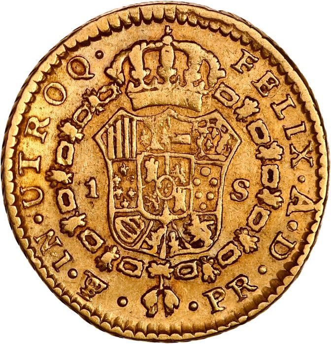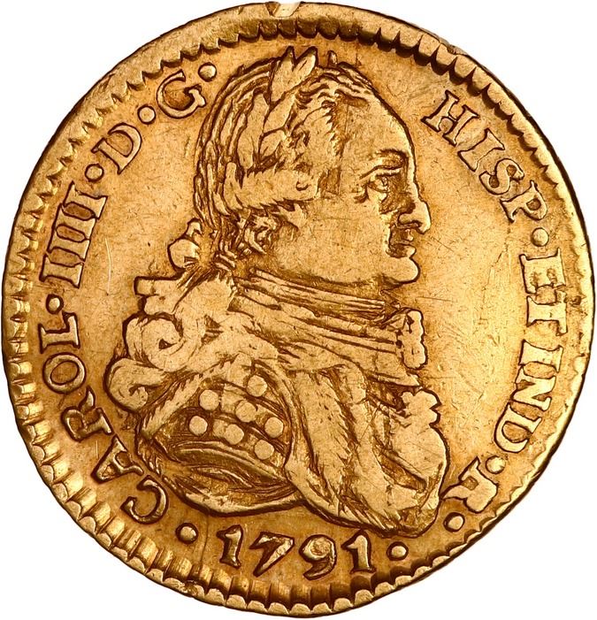 BOLIVIA, Potosí, gold bust 1 escudo, Charles IV, 1791 PR, laureate bust, very rare, NGC AU details / bent, ex-Almenara. Janson-75.3.1; Cal-1175; Fr-13; KM-74. Rich gold color with full details, trace of toning on reverse, parts of rims crude (as made, including small chip in edge at top), very low mintage of just 558 coins (which includes the non-laureate bust issue as well). Pedigreed to the Almenara Collection (stated on label).