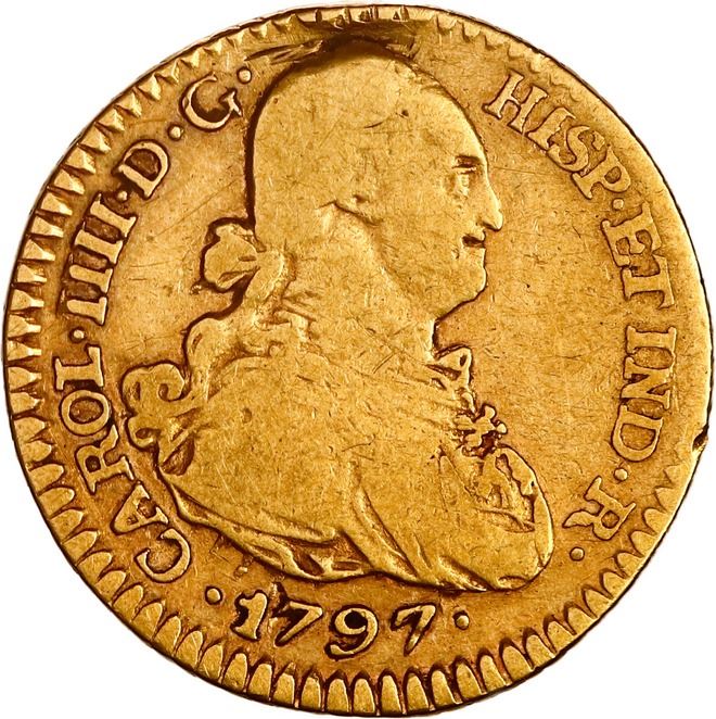 BOLIVIA, Potosí, gold bust 1 escudo, Charles IV, 1797 PP, rare, NGC VF details / plugged, finest and only example in NGC census, ex-Almenara. Janson-75.9; Cal-1183; Fr-17; KM-78. Worn but well detailed, with faint toning on fields, crudely repaired plug at top. Pedigreed to the Almenara Collection (stated on label).