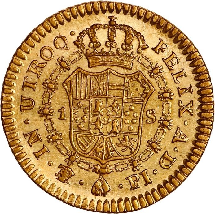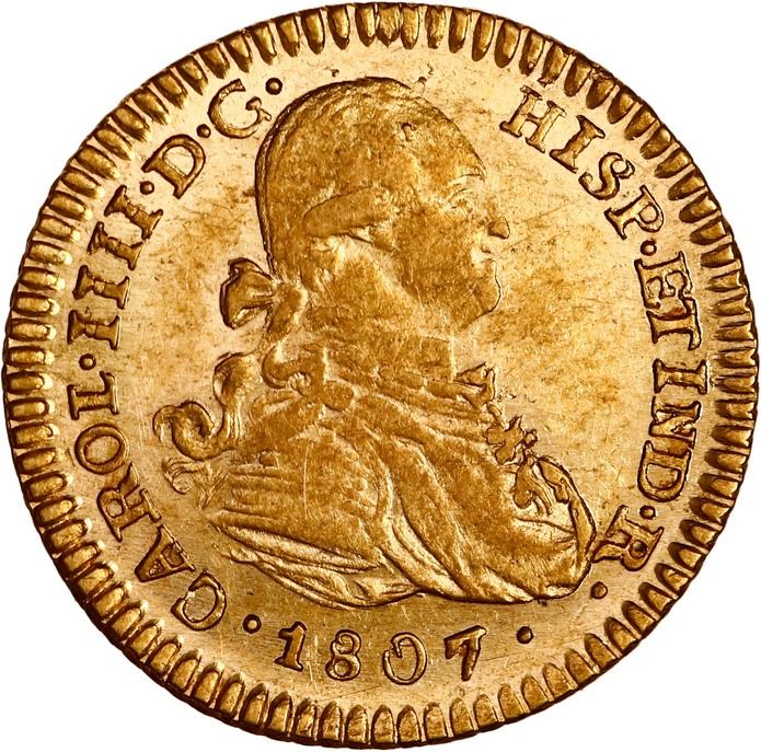BOLIVIA, Potosí, gold bust 1 escudo, Charles IV, 1807 PJ, rare, NGC AU 58, finest known in NGC census, ex-Almenara. Janson-75.19; Cal-1193; Fr-17; KM-78. Very choice luster and rims, central details on reverse 100% sharp and MS quality but bust slightly weaker, light in color. Pedigreed to the Almenara Collection (stated on label).