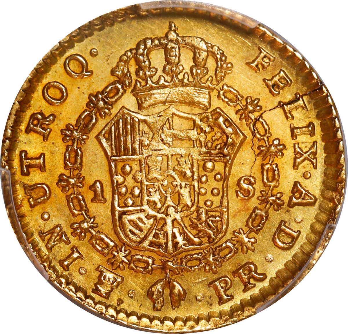 BOLIVIA, Potosí, gold bust 1 escudo, Charles IV transitional (bust of Charles III, ordinal IV), 1790 PR, very rare, PCGS UNC details / cleaned. Janson-75.2; Cal-1174; KM-65; Fr-9. Very bold strike with choice details so deeply impressed that the flan cracked slightly (also very high rims), smooth and lustrous fields (very faintly hairlined), very small mintage of just 1,428 coins.