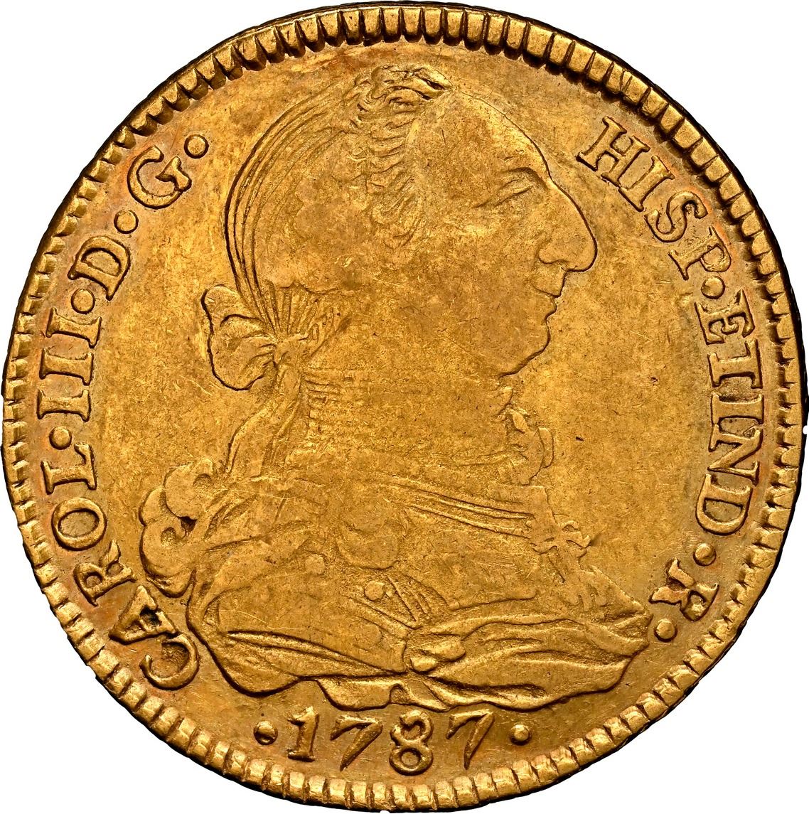 BOLIVIA, Potosí, gold bust 4 escudos, Charles III, 1787 PR, very rare, NGC XF 45, finest and only ex