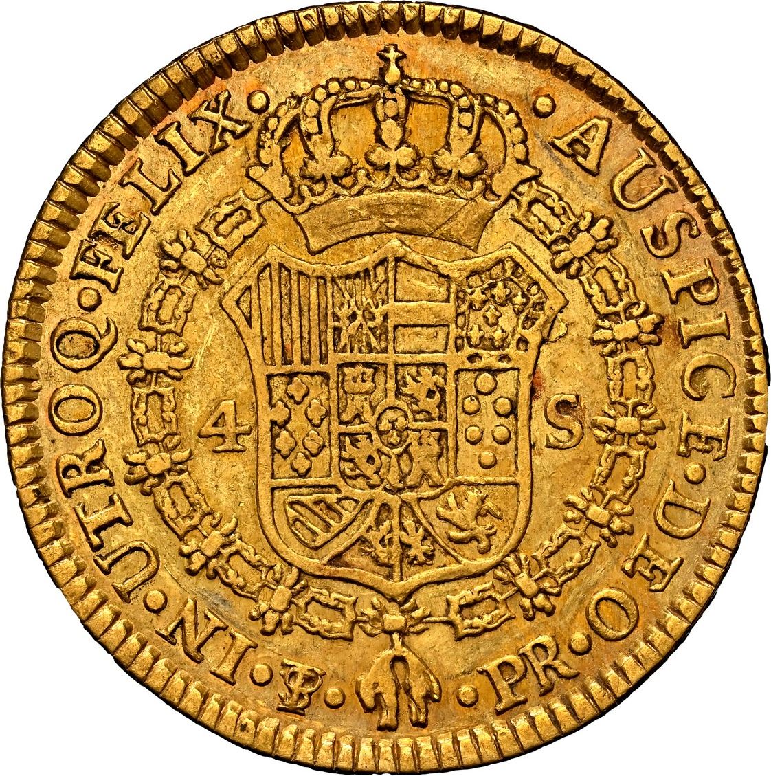 BOLIVIA, Potosí, gold bust 4 escudos, Charles III, 1787 PR, very rare, NGC XF 45, finest and only example in the NGC census, ex-Hammel, ex-Eliasberg, ex-Almenara. Janson-69.10; Cal-1853; Fr-2; KM-58. Softly struck but with full rims, faint colorful toning over muted luster, desirable pedigree, very low mintage (just 527 coins). Pedigreed to the Eliasberg Collection (American Numismatic Rarities auction of April 2005, lot 1027, purchased from Mortimer Hammel on April 18, 1945), and the Almenara Collection.