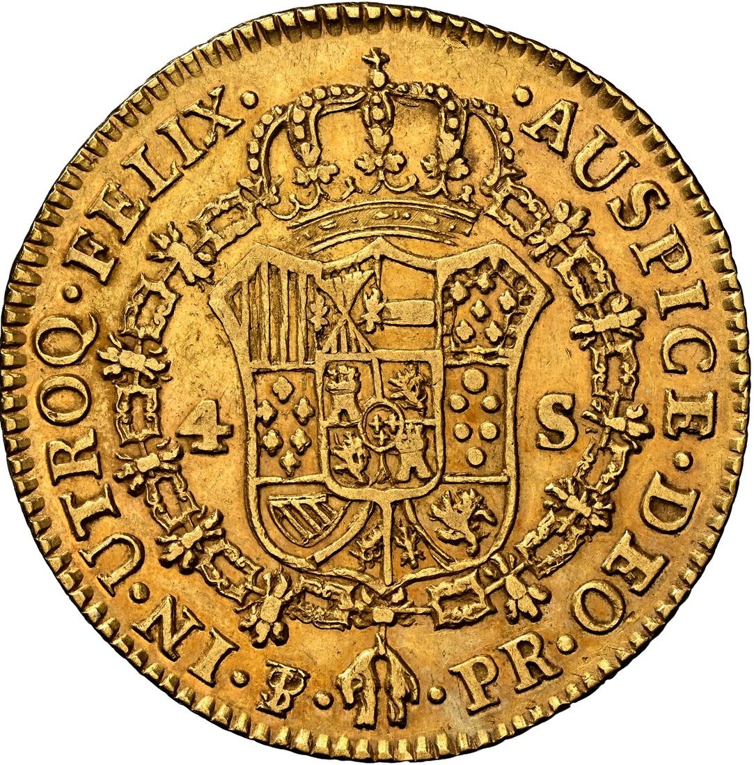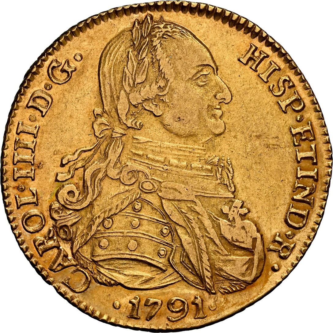 BOLIVIA, Potosí, gold bust 4 escudos, Charles IV, 1791 PR, laureate bust, very rare, NGC AU 53, ex-Almenara, ex-Caballero, Calicó Plate. Janson-73.3.1; Cal-1521; Fr-11; KM-76. Rich gold color with good luster, strong strike, just some honest high-point wear, second finest in NGC census behind a single AU 58 (see Sedwick Auction 20, lot 89), a classic one-year rarity from an exceedingly low mintage of just 170 coins that includes the non-laureate type as well. Pedigreed to the Almenara Collection and to the Caballero de las Yndias Collection (Aureo & Calicó auction of April 2009, lot 16), plate coin on page 412 of Calicó's Numismática española (2019) (both stated on label).