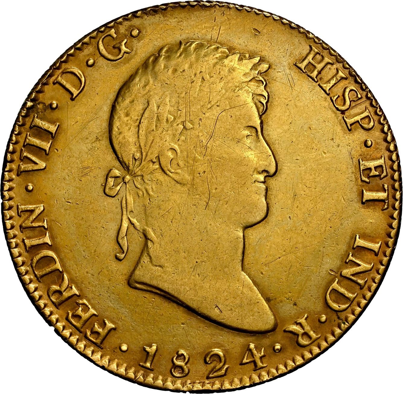 BOLIVIA, Potosí, gold bust 8 escudos, Ferdinand VII, 1824 PJ, rare, NGC AU details / repaired, ex-Almenara. Janson-82.3; Cal-1828; Fr-19; KM-91. Bold details, matte surfaces with old scratches and marks on obverse, rare final year of colonial gold. Pedigreed to the Almenara Collection.