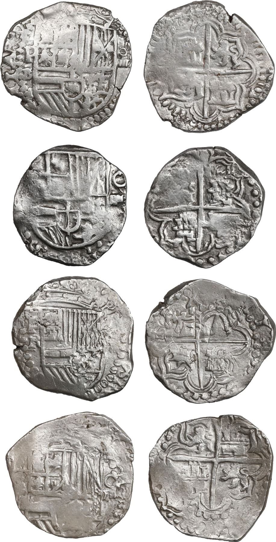 BOLIVIA, Potosí, lot of four cob 4 reales, Philip II and III, assayer B or R where visible. 53.59 grams total. Nice group of cobs with bold shield and crosses (some with a little doubling), all generally XF or slightly better.