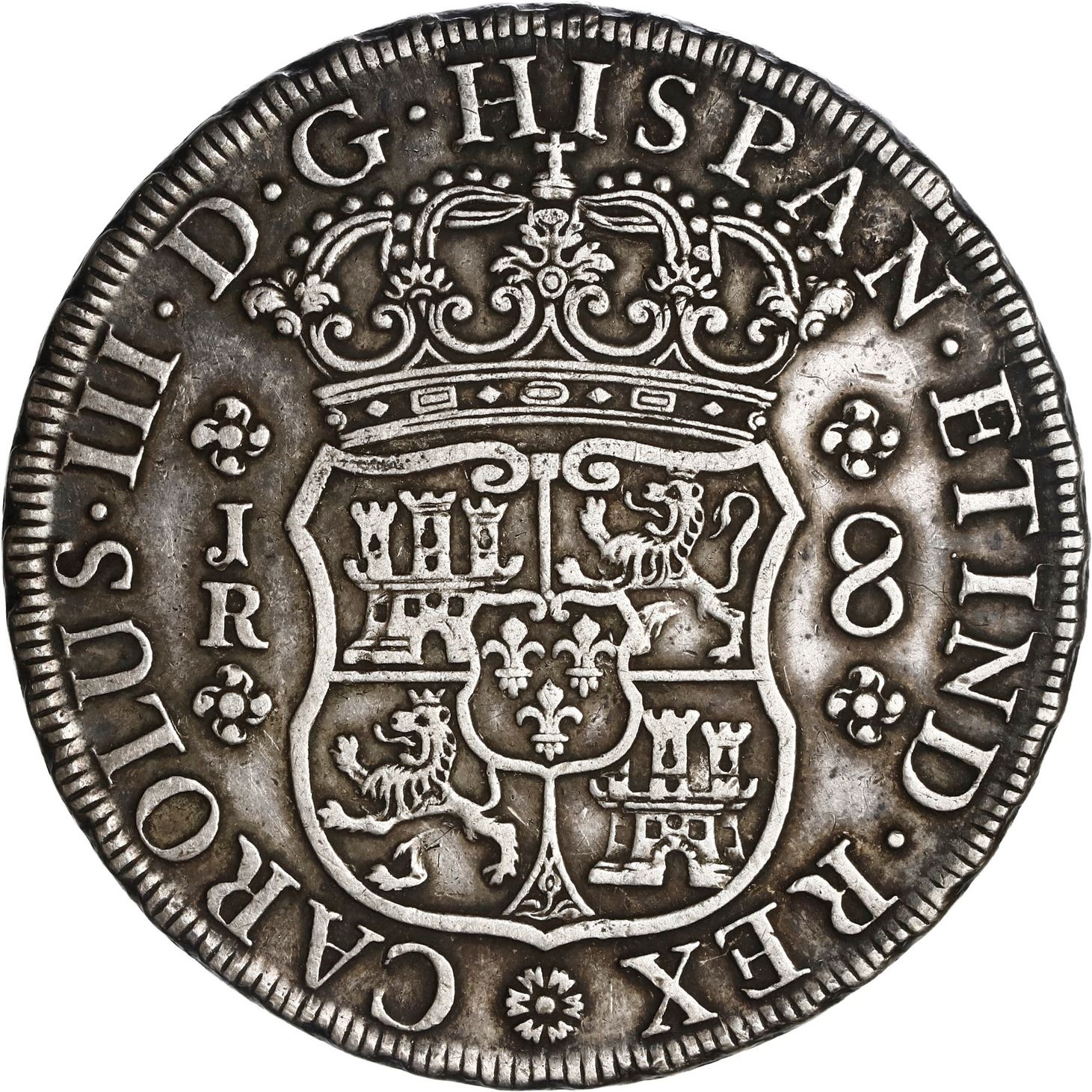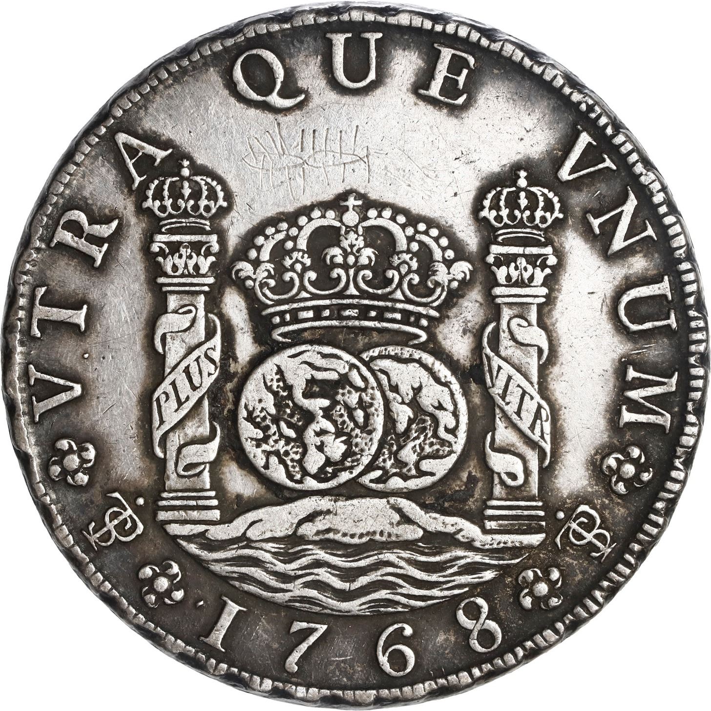 BOLIVIA, Potosí, pillar 8 reales, Charles III, 1768 JR, hooked 6, six-petaled rosette below shield, dot after CAROLUS, ex-Brameld. Yonaka-P8.68b1; Janson-58.2.2; Cal-1160; KM-50. 26.93 grams. XF with deeply contrasting toning, lightly cleaned fields with strange graffito above crown above globes, scarce variety. Pedigreed to the David Brameld Collection.