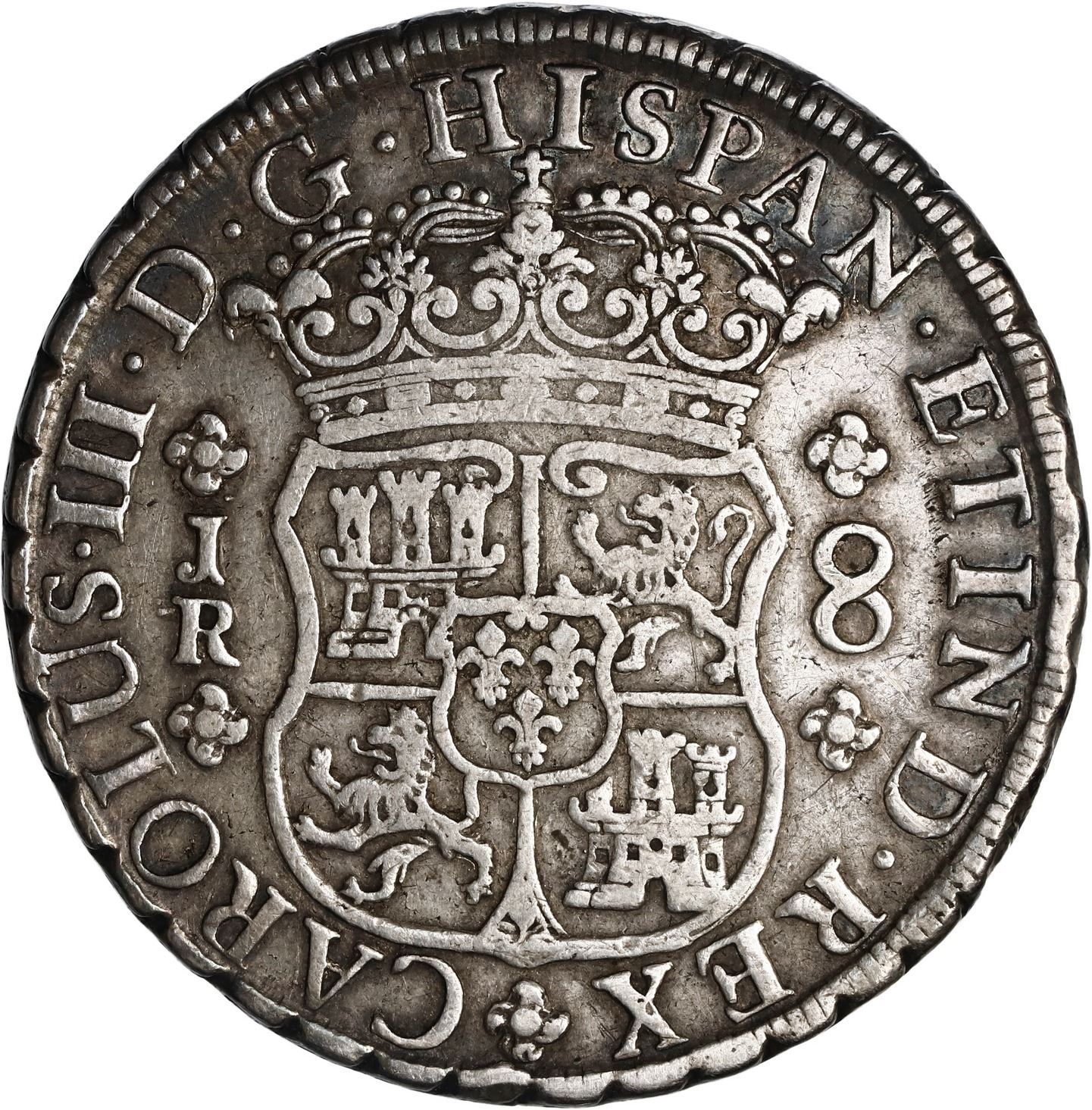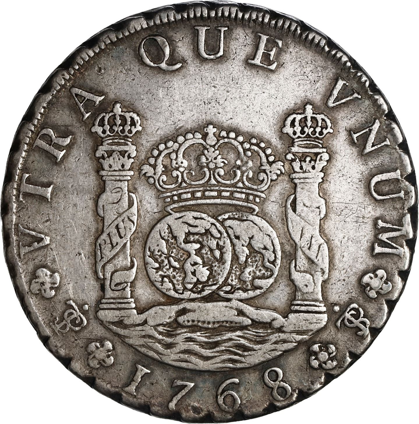 BOLIVIA, Potosí, pillar 8 reales, Charles III, 1768 JR, normal 6 and 8, four-petaled floret below shield, dot after CAROLUS, very rare, ex-Brameld. Yonaka-P8.68a; Janson-58.2.4; Cal-1163; KM-50. 26.66 grams. VF+ with light, contrasting toning, slightly off-center strike, fields cleaned long ago, this variety rated R2 in Yonaka. Pedigreed to the David Brameld Collection.
