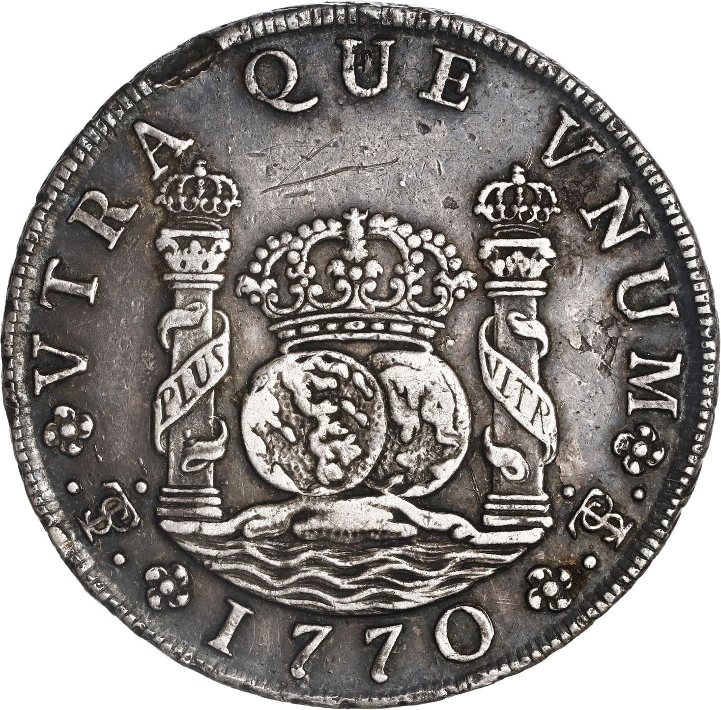 BOLIVIA, Potosí, pillar 8 reales, Charles III, 1770 JR, no dot after CAROLVS, ex-Brameld.