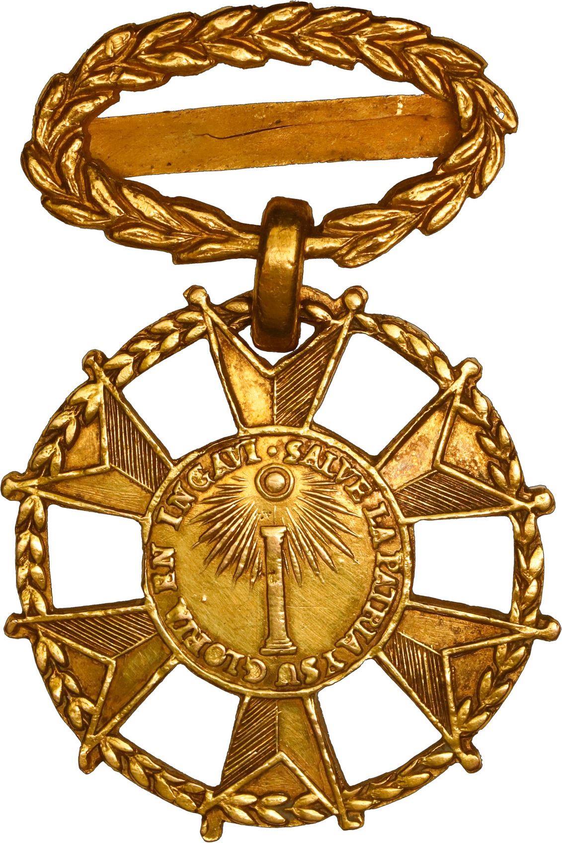 BOLIVIA, gold military decoration, 1841, Ingaví, very rare. Ross & Stahl-B12a (but without enamel). 16.57 grams. 32 mm. A round decoration with laurel periphery supported by six triangular spokes leading to a small central medallion whose obverse shows radiant sun above column within legend SALVE LA PATRIA YSU GLORIA EN INGAVI•, the reverse showing legend 18 DE NOVIEMBRE above DE 1841 above mountain lands; a crimped flat jump ring connects the top to an oval wreath hanger with flat back for ribbon. Overall in good condition, the central medallion boldly detailed but polished and heavily striated on reverse.