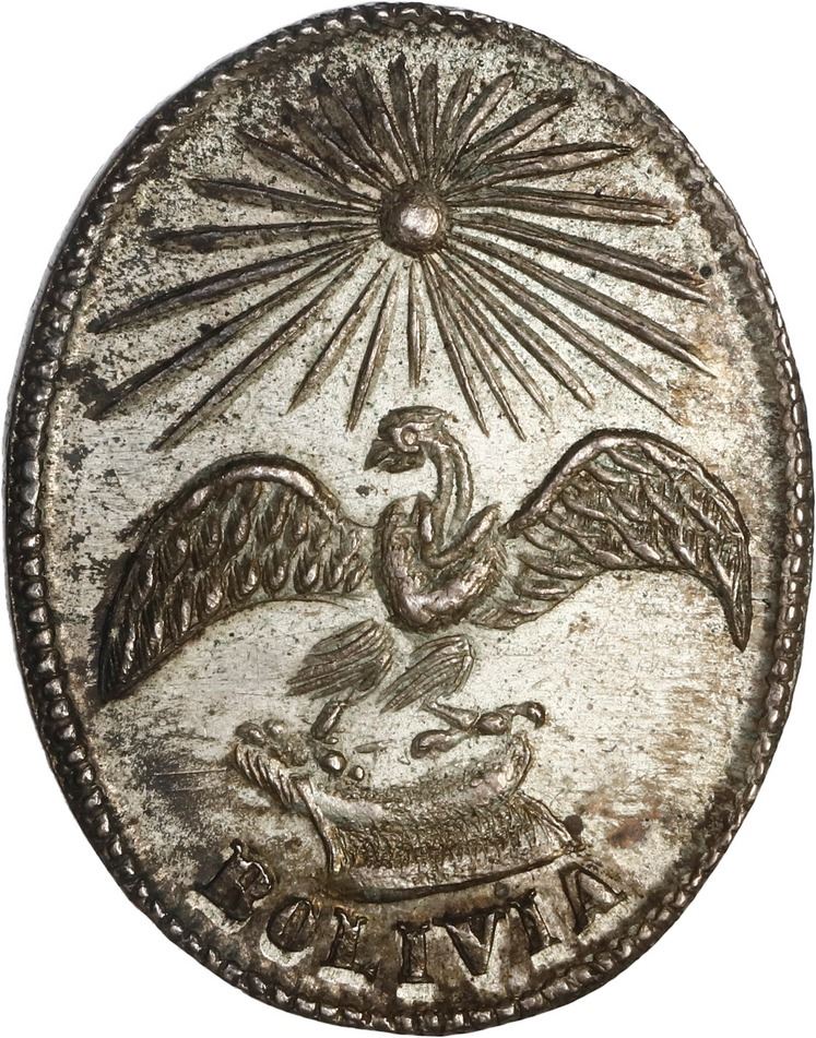 BOLIVIA, oval lead medal, no date (ca. 1840), oval scholar prize. 10.10 grams. 25 x 20 mm. Obverse: condor below radiant sun, BOLIVIA below; Reverse: llama and tree at base of Cerro de Potosí below sun with nine stars above and wreath below, PREMIO A SU APLICACION Y ADELANTAMIENTO encircling; Edge: plain. Interesting scholar medal which is not listed in Medallas Monetarias y Conmemorativas de Bolivia 1825-1925, not dated but of the manufacture of mid-1800s, the collector tag included notes "ca. 1840" and calls it a piefort though the weight is in line with other award medals of the time. The reverse is very similar to the 1869 Bolivian oval award medal but not exact. AU+ with bold details, subdued luster with mottled toning of green and red hues.