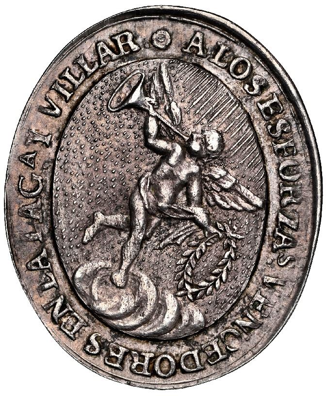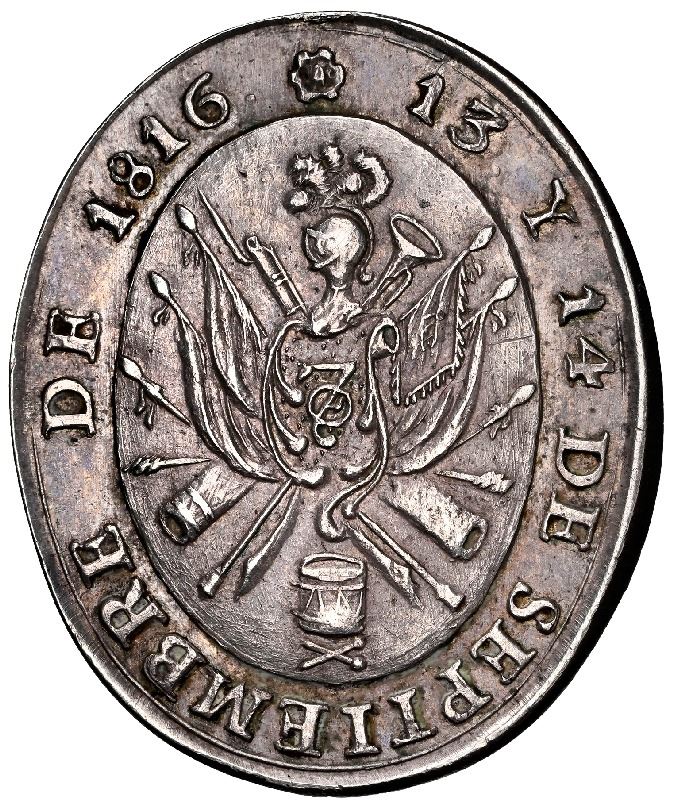 BOLIVIA, oval silver medal, Ferdinand VII, dated 1816, victors of Laguna and Villar, NGC AU 58, finest and only example in NGC census, ex-Derman. Cunietti-p. 58; Fonrobert-8026. Rare medal (first we have offered) struck in Potosí and issued to Royalist forces for their part in the Battle of La Laguna in El Villar on September 13-14, 1816 (listed in Fonrobert as La Guaira under Colombia in error). Obverse with winged victory sounding its horn and holding a laurel over clouds, legend encircling A LOS ESFORZAS VENCEDORES EN LA LAGA Y VILLAR. and florette above; reverse with knight's helm above crossed cannons, flags, musket, and trumpet with drum and drumsticks below, 13 Y 14 DE SEPTIEMBRE DE 1816. encircling with florette at top; smooth edge. Lustrous example with well-struck details throughout, slight golden toning across its surfaces. As outlined in Cunietti, this medal was effectively a reward for the defeat and capture of guerrilla leader Manuel Asencio Padilla in his attempt to rescue his pregnant wife, Juana Azurduy de Padilla (who was herself a military leader during the fight for independence) during the Battle of La Laguna in modern-day Bolivia. Padilla was summarily executed by beheading, and his head was displayed publicly to further thwart the revolution. In 1827 the former town of La Laguna (originally San Miguel de La Laguna) was renamed Padilla in his memory. Pedigreed to the Alberto "Coco" Derman collection.