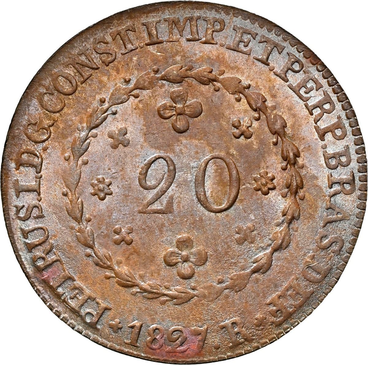 BRAZIL, Rio, copper 20 reis, Pedro I, 1827-R, NGC MS 63 BN, finest known in NGC census.