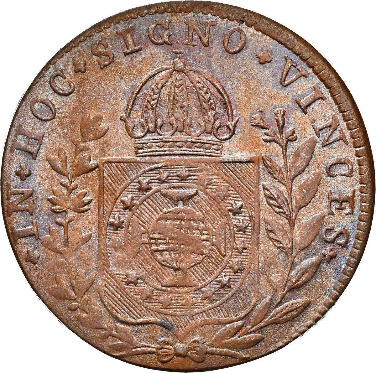 BRAZIL, Rio, copper 20 reis, Pedro I, 1827-R, NGC MS 63 BN, finest known in NGC census. LMB-583; KM-360.1. 4.48 grams. Colorful patchy toning over luster, very choice grade for this series (the next finest and only other example in the NGC census being just AU 53), with the look of a presentation piece along with the previous two lots.