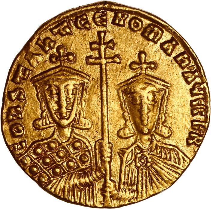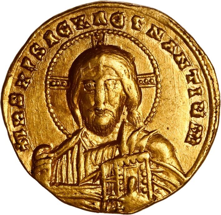 BYZANTINE EMPIRE, Constantinople, AV solidus, Constantine VII and Romanus II, ca. 945-963 AD. Sear 1751. 4.44 grams. Bust of Christ facing, wearing nimbus cruciger, raising right hand in benediction, book of Gospels cradled in left arm / Crowned facing busts of Constantine II (on left) and Romanus (on right), jointly holding patriarchal cross with globular terminus between them. Lovely, full-flan AU with rich details and lustrous toning.