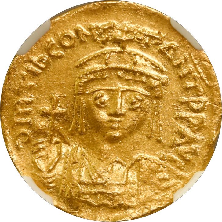 BYZANTINE EMPIRE, Constantinople, AV solidus, Tiberius II Constantine, 578-582 AD, NGC AU / clipped, graffiti. DOC 38; MIB 5. Draped and cuirassed bust of Tiberius II facing, wearing plumed helmet with diadem and pendilia, holding globus cruciger in his right hand and shield / Cross potent set on four steps, CONOB in exergue. Lustrous and well centered, clipped edge at 4 o'clock on obverse, above that a few straight lines near edge.