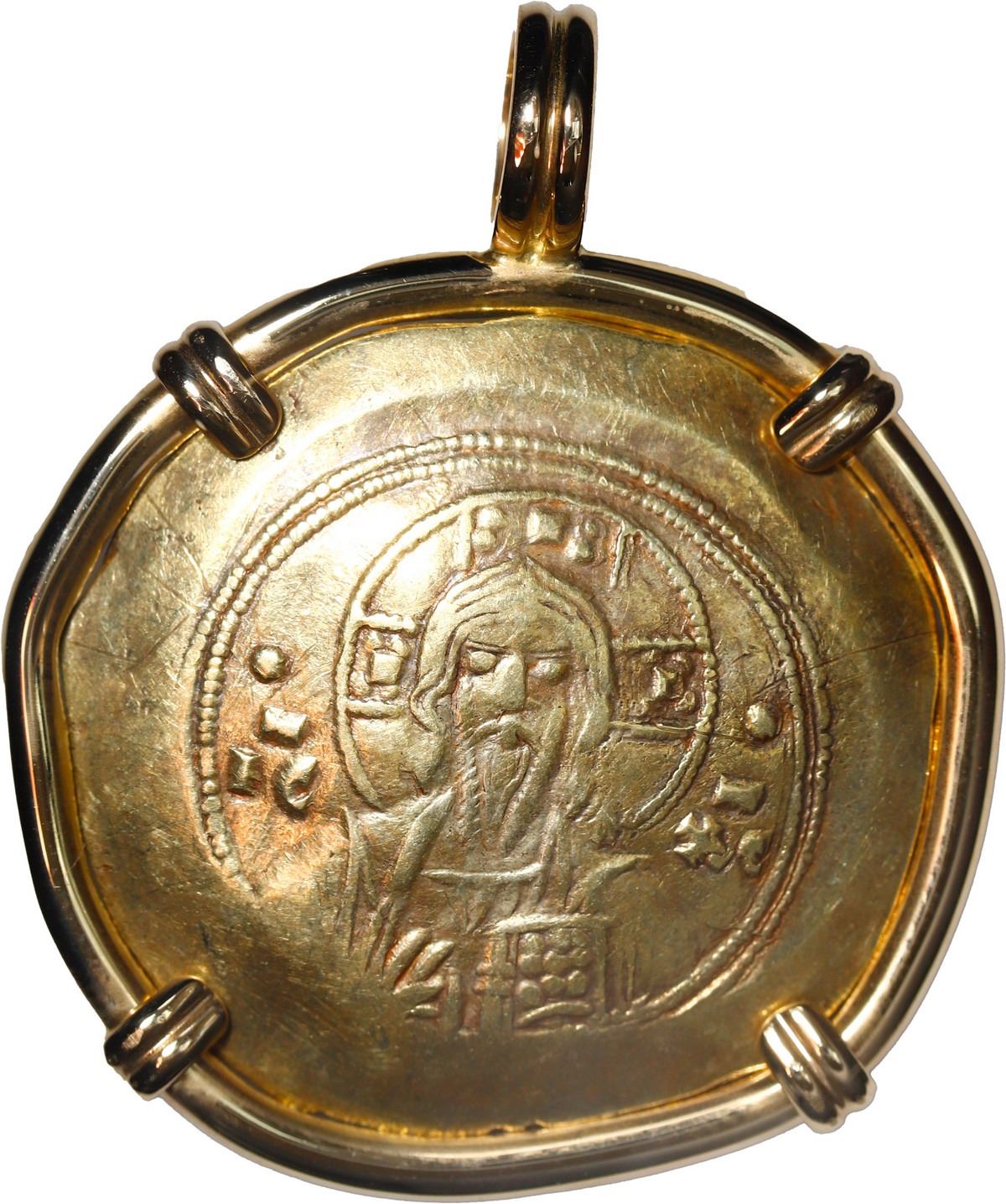 BYZANTINE EMPIRE, Constantinople mint, AV histamenon nomisma, Michael VII, 1071-1078 AD, mounted Christ-side out in 14K gold pendant with fixed bail. 10.47 grams total. Facing bust of Christ Pantokrator / Crowned facing bust of Michael, wearing loros, holding labarum with pellet on shaft and globus cruciger. Large thin XF coin, typically cupped planchet, with pale golden surfaces, well centered in custom rounded-wire bezel.