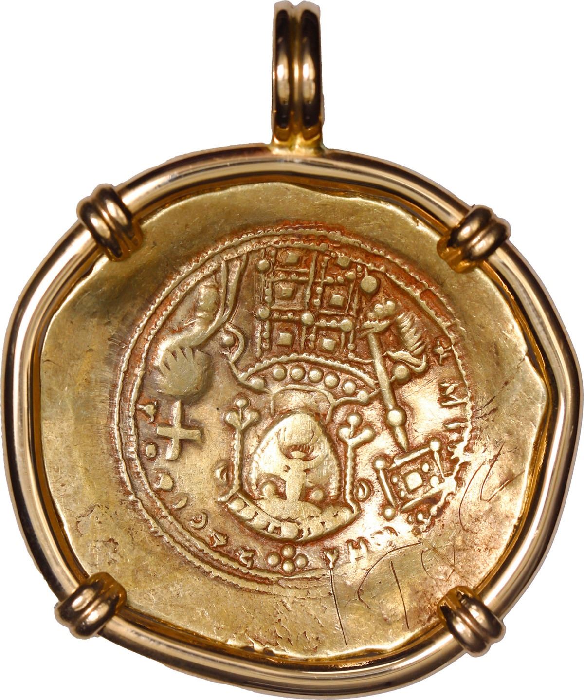 BYZANTINE EMPIRE, Constantinople mint, AV histamenon nomisma, Michael VII, 1071-1078 AD, mounted Christ-side out in 14K gold pendant with fixed bail. 10.47 grams total. Facing bust of Christ Pantokrator / Crowned facing bust of Michael, wearing loros, holding labarum with pellet on shaft and globus cruciger. Large thin XF coin, typically cupped planchet, with pale golden surfaces, well centered in custom rounded-wire bezel.
