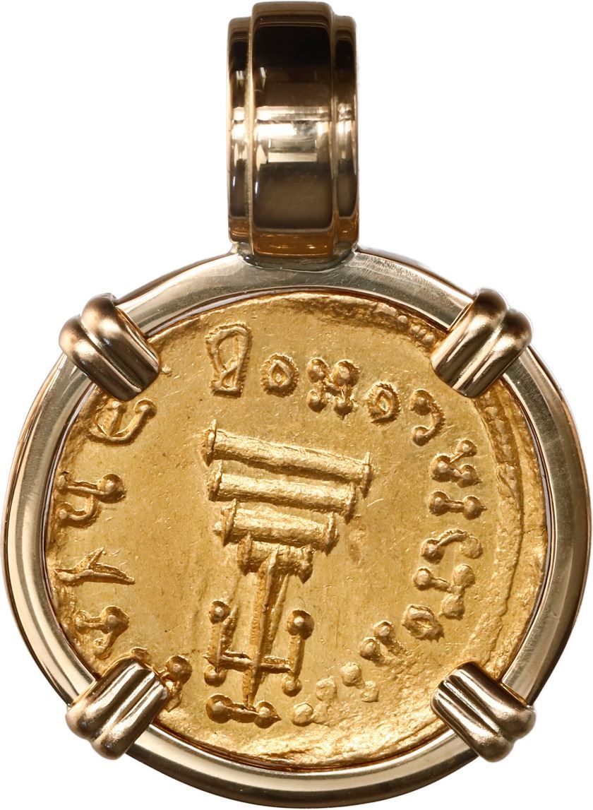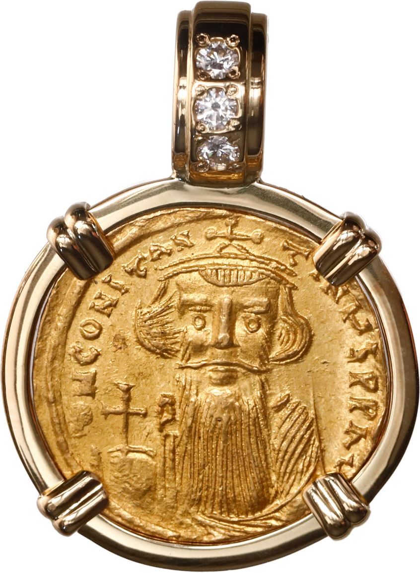 BYZANTINE EMPIRE, Constantinople mint, AV solidus, Constans II, 641-668 AD, mounted bust-side out in 18K gold pendant with fixed bail and diamonds. Sear 956. 9.21 grams total. Crowned and draped bust facing, holding globus cruciger / Cross potent set on three steps, CONOB in exergue. AU coin with bold detail, mounted in a custom, flat-sided bezel with a thick gold bail and diamonds, an impressive setting.